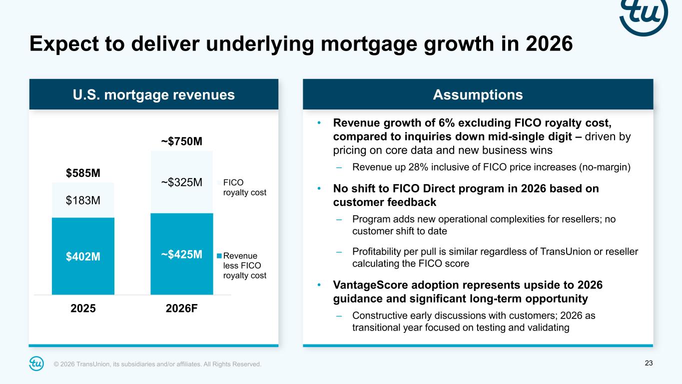 © 2026 TransUnion, its subsidiaries and/or affiliates. All Rights Reserved. 22 Credit data is a foundation to safe underwriting Pricing approach preserves profitability and promotes lender choice VantageScore adoption is incremental profit and margin opportunity • Efficacy of underwriting is driven by quality and amount of underlying data • GSEs make underwriting decisions based on trended data from the bureaus, not 3rd party scores • Credit scores depend on credit bureaus’ data stewardship • TU differentiated with 30 months of trended data, plus rental and utility tradelines • Reflects that the main value in lending is in the data • VantageScore ($4) offered at 60% discount to FICO score • 2026 credit data + VantageScore cost ($15) is ~flat compared to 2025 • No impact on TU profitability from potential changes in 3rd party score delivery models • Positioned to unlock full benefit of trended and alternative data to the mortgage market • Actively working with lenders, resellers and GSEs to drive adoption of lower-cost, consumer friendly option • Next milestone expected is GSE loan level price adjustment (LLPA) matrix for VantageScore TransUnion is positioned for success in U.S. mortgage