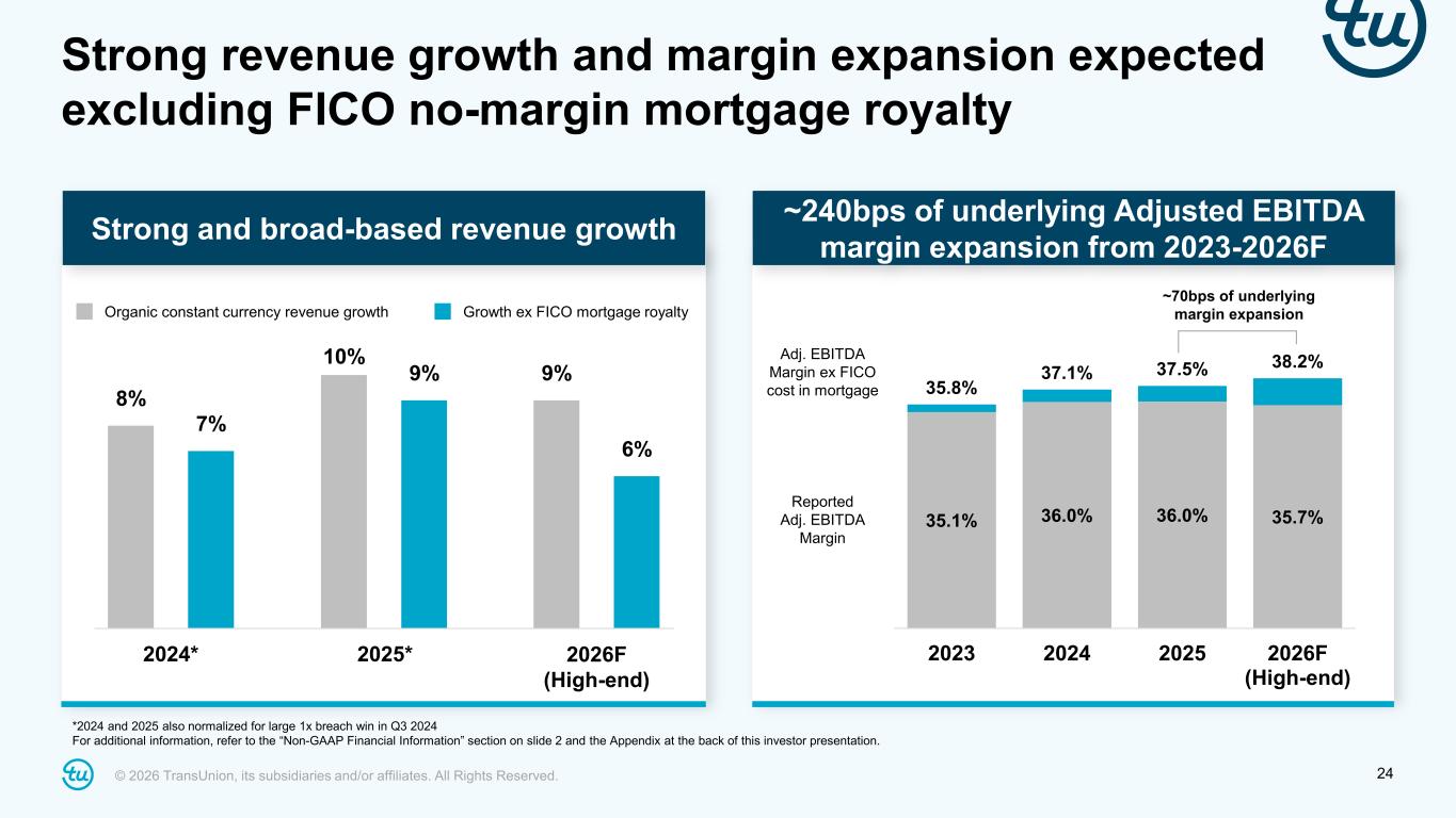 © 2026 TransUnion, its subsidiaries and/or affiliates. All Rights Reserved. 23 U.S. mortgage revenues Assumptions Expect to deliver underlying mortgage growth in 2026 • Revenue growth of 6% excluding FICO royalty cost, compared to inquiries down mid-single digit – driven by pricing on core data and new business wins – Revenue up 28% inclusive of FICO price increases (no-margin) • No shift to FICO Direct program in 2026 based on customer feedback – Program adds new operational complexities for resellers; no customer shift to date – Profitability per pull is similar regardless of TransUnion or reseller calculating the FICO score • VantageScore adoption represents upside to 2026 guidance and significant long-term opportunity – Constructive early discussions with customers; 2026 as transitional year focused on testing and validating $402M ~$425M $183M ~$325M $585M ~$750M 2025 2026F FICO royalty cost Revenue less FICO royalty cost