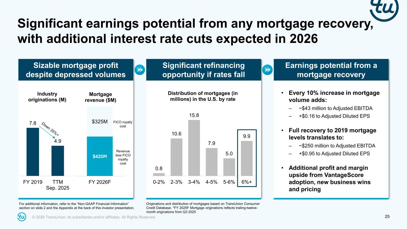 © 2026 TransUnion, its subsidiaries and/or affiliates. All Rights Reserved. 24 Strong and broad-based revenue growth ~240bps of underlying Adjusted EBITDA margin expansion from 2023-2026F Strong revenue growth and margin expansion expected excluding FICO no-margin mortgage royalty 2025* 2026F (High-end) 10% 9% 9% 6% 35.1% 36.0% 36.0% 35.7% 35.8% 37.1% 37.5% 38.2% 2023 2024 2025 2026F (High-end) Reported Adj. EBITDA Margin Adj. EBITDA Margin ex FICO cost in mortgage8% 7% 2024* Organic constant currency revenue growth Growth ex FICO mortgage royalty ~70bps of underlying margin expansion *2024 and 2025 also normalized for large 1x breach win in Q3 2024 For additional information, refer to the “Non-GAAP Financial Information” section on slide 2 and the Appendix at the back of this investor presentation.