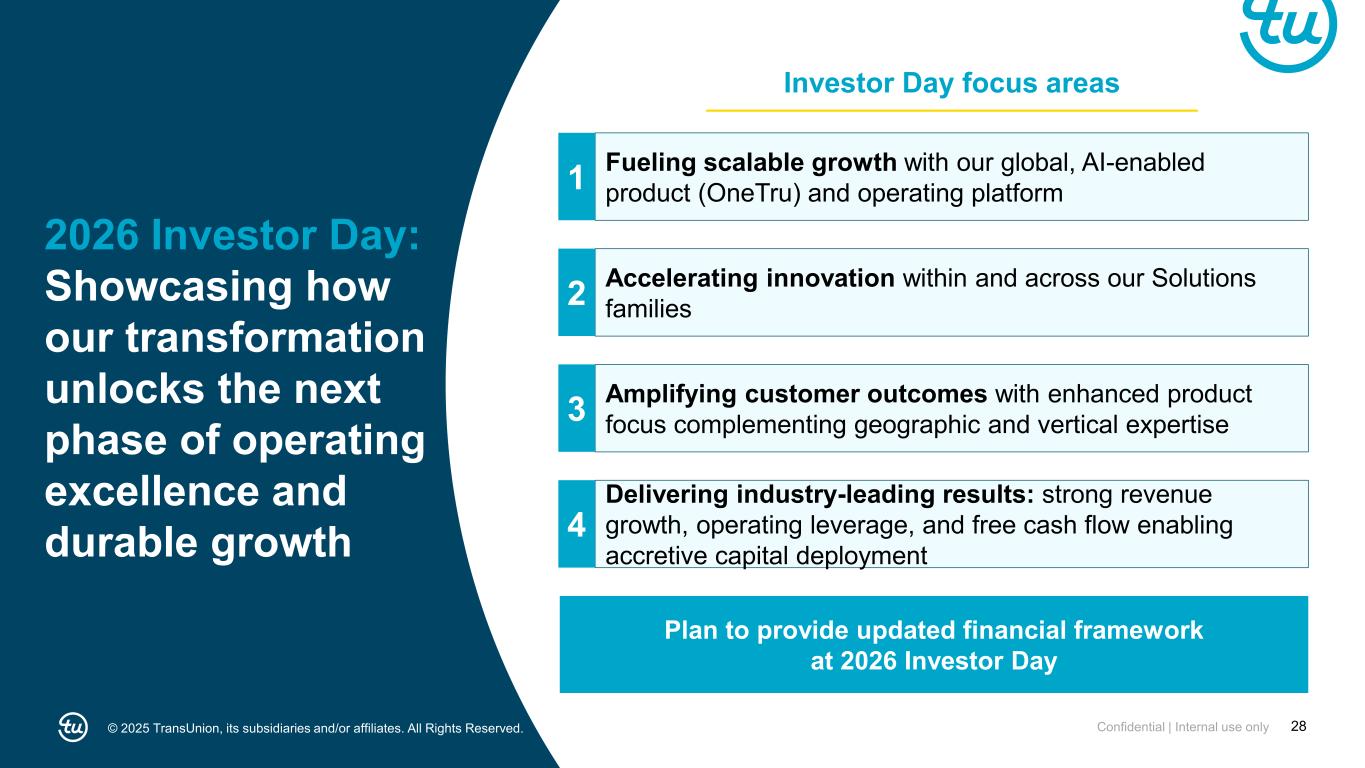 © 2026 TransUnion, its subsidiaries and/or affiliates. All Rights Reserved. 28Confidential | Internal use only5 2026 Investor Day: Showcasing how our transformation unlocks the next phase of operating excellence and durable growth Fueling scalable growth with our global, AI-enabled product (OneTru) and operating platform1 Accelerating innovation within and across our Solutions families2 Amplifying customer outcomes with enhanced product focus complementing geographic and vertical expertise3 Delivering industry-leading results: strong revenue growth, operating leverage, and free cash flow enabling accretive capital deployment 4 Plan to provide updated financial framework at 2026 Investor Day Investor Day focus areas