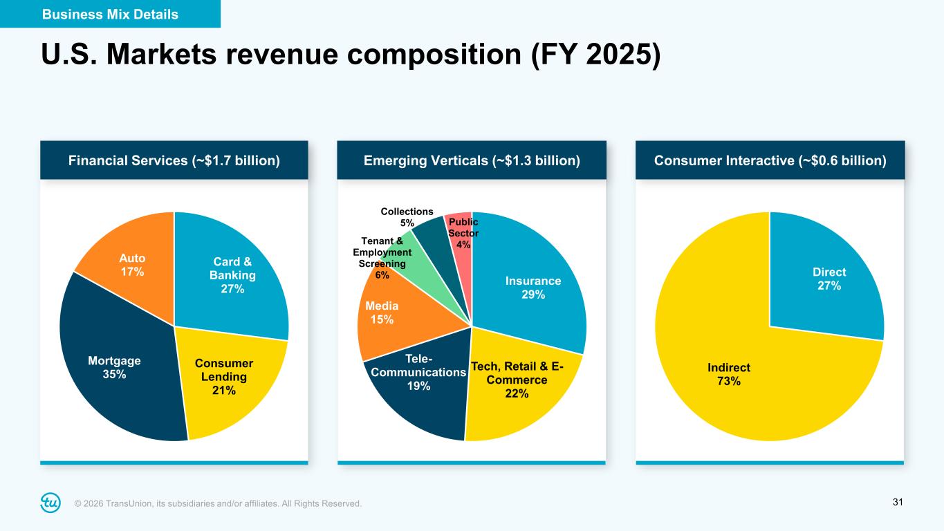 © 2026 TransUnion, its subsidiaries and/or affiliates. All Rights Reserved. 31 U.S. Markets revenue composition (FY 2025) Card & Banking 27% Consumer Lending 21% Mortgage 35% Auto 17% Insurance 29% Tech, Retail & E- Commerce 22% Tele- Communications 19% Media 15% Tenant & Employment Screening 6% Collections 5% Public Sector 4% Direct 27% Indirect 73% Financial Services (~$1.7 billion) Emerging Verticals (~$1.3 billion) Consumer Interactive (~$0.6 billion) Business Mix Details