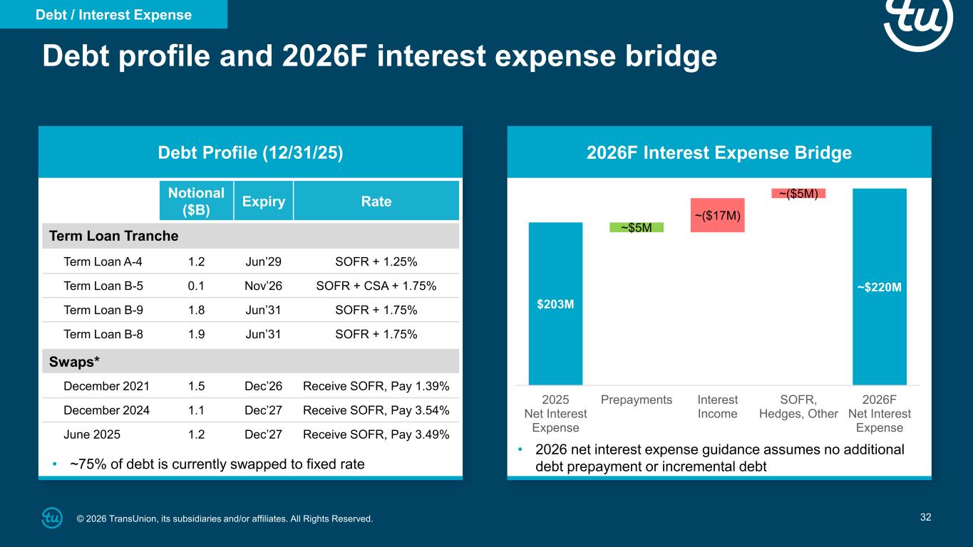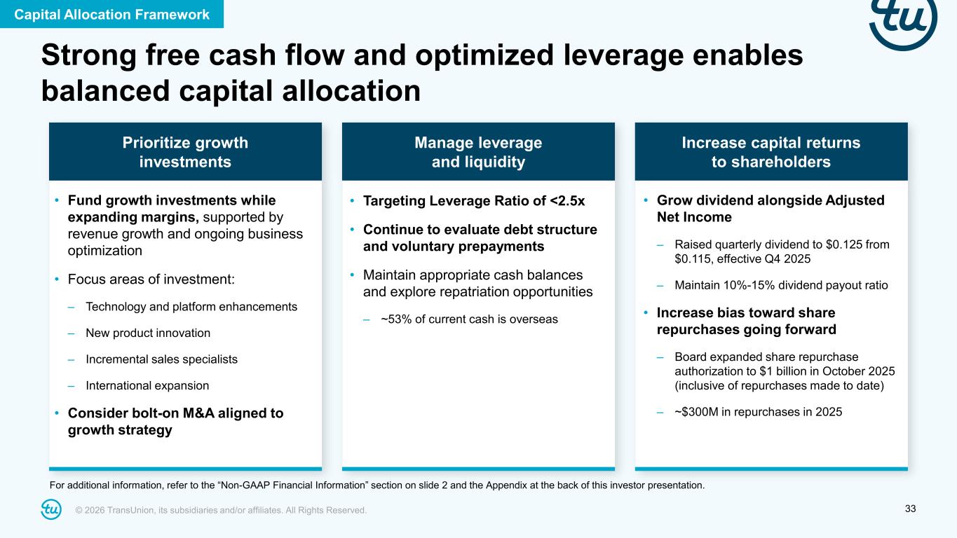 32© 2026 TransUnion, its subsidiaries and/or affiliates. All Rights Reserved. Debt profile and 2026F interest expense bridge Debt Profile (12/31/25) 2026F Interest Expense Bridge Notional ($B) Expiry Rate Term Loan Tranche Term Loan A-4 1.2 Jun’29 SOFR + 1.25% Term Loan B-5 0.1 Nov’26 SOFR + CSA + 1.75% Term Loan B-9 1.8 Jun’31 SOFR + 1.75% Term Loan B-8 1.9 Jun’31 SOFR + 1.75% Swaps* December 2021 1.5 Dec’26 Receive SOFR, Pay 1.39% December 2024 1.1 Dec’27 Receive SOFR, Pay 3.54% June 2025 1.2 Dec’27 Receive SOFR, Pay 3.49% • ~75% of debt is currently swapped to fixed rate • 2026 net interest expense guidance assumes no additional debt prepayment or incremental debt Debt / Interest Expense $203M ~$220M ~$5M ~($17M) ~($5M) 2025 Net Interest Expense Prepayments Interest Income SOFR, Hedges, Other 2026F Net Interest Expense