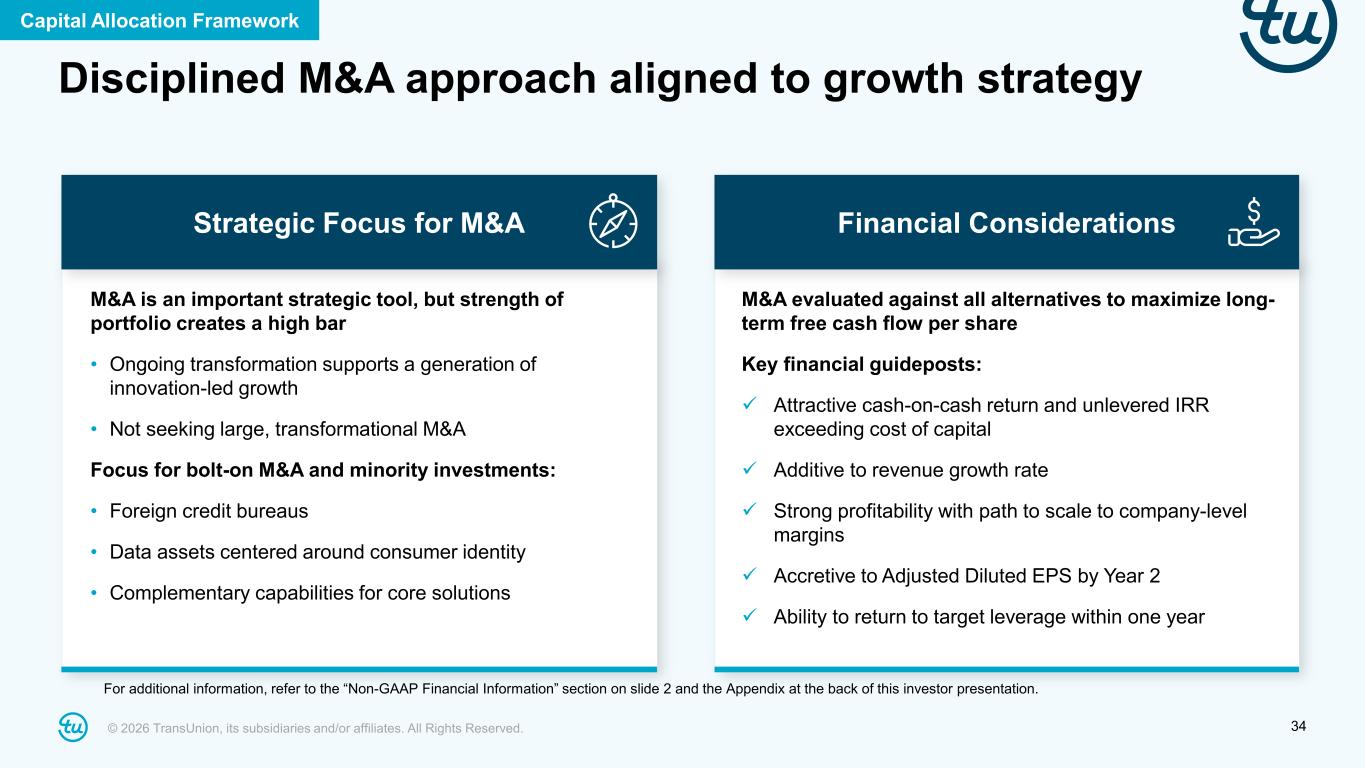 © 2026 TransUnion, its subsidiaries and/or affiliates. All Rights Reserved. 33 Strong free cash flow and optimized leverage enables balanced capital allocation Capital Allocation Framework For additional information, refer to the “Non-GAAP Financial Information” section on slide 2 and the Appendix at the back of this investor presentation. Prioritize growth investments • Fund growth investments while expanding margins, supported by revenue growth and ongoing business optimization • Focus areas of investment: – Technology and platform enhancements – New product innovation – Incremental sales specialists – International expansion • Consider bolt-on M&A aligned to growth strategy Manage leverage and liquidity • Targeting Leverage Ratio of <2.5x • Continue to evaluate debt structure and voluntary prepayments • Maintain appropriate cash balances and explore repatriation opportunities – ~53% of current cash is overseas Increase capital returns to shareholders • Grow dividend alongside Adjusted Net Income – Raised quarterly dividend to $0.125 from $0.115, effective Q4 2025 – Maintain 10%-15% dividend payout ratio • Increase bias toward share repurchases going forward – Board expanded share repurchase authorization to $1 billion in October 2025 (inclusive of repurchases made to date) – ~$300M in repurchases in 2025