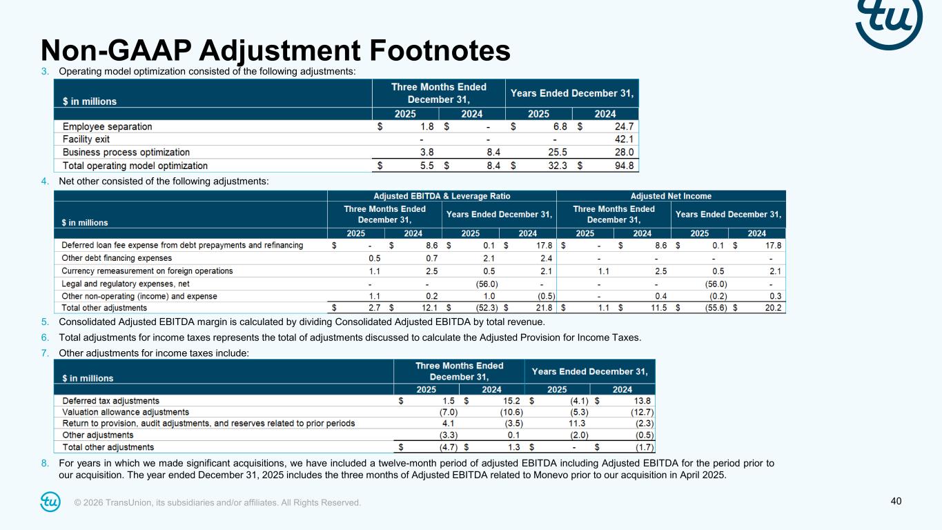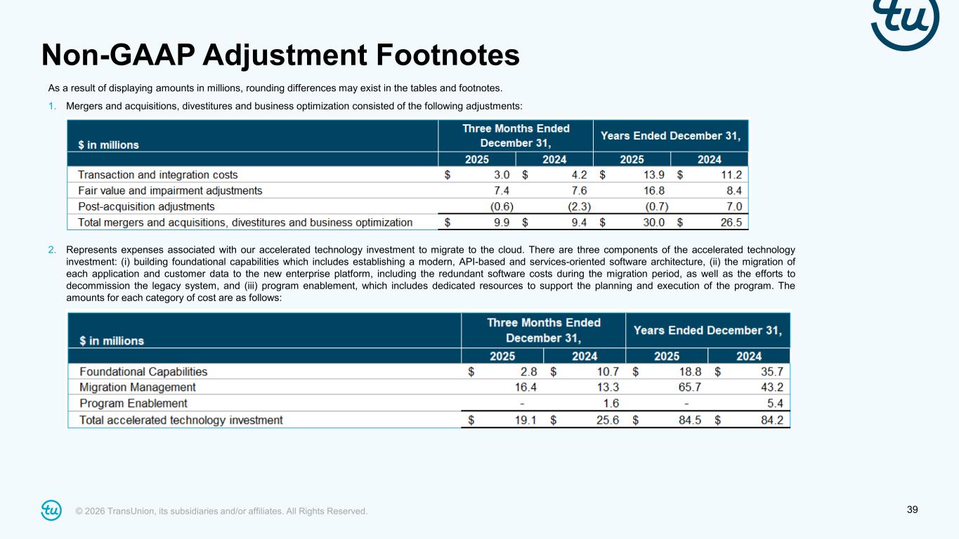 © 2026 TransUnion, its subsidiaries and/or affiliates. All Rights Reserved. 39 Non-GAAP Adjustment Footnotes As a result of displaying amounts in millions, rounding differences may exist in the tables and footnotes. 1. Mergers and acquisitions, divestitures and business optimization consisted of the following adjustments: 2. Represents expenses associated with our accelerated technology investment to migrate to the cloud. There are three components of the accelerated technology investment: (i) building foundational capabilities which includes establishing a modern, API-based and services-oriented software architecture, (ii) the migration of each application and customer data to the new enterprise platform, including the redundant software costs during the migration period, as well as the efforts to decommission the legacy system, and (iii) program enablement, which includes dedicated resources to support the planning and execution of the program. The amounts for each category of cost are as follows: