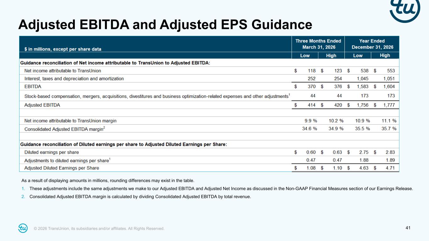 © 2026 TransUnion, its subsidiaries and/or affiliates. All Rights Reserved. 40 Non-GAAP Adjustment Footnotes 3. Operating model optimization consisted of the following adjustments: 4. Net other consisted of the following adjustments: 5. Consolidated Adjusted EBITDA margin is calculated by dividing Consolidated Adjusted EBITDA by total revenue. 6. Total adjustments for income taxes represents the total of adjustments discussed to calculate the Adjusted Provision for Income Taxes. 7. Other adjustments for income taxes include: 8. For years in which we made significant acquisitions, we have included a twelve-month period of adjusted EBITDA including Adjusted EBITDA for the period prior to our acquisition. The year ended December 31, 2025 includes the three months of Adjusted EBITDA related to Monevo prior to our acquisition in April 2025.