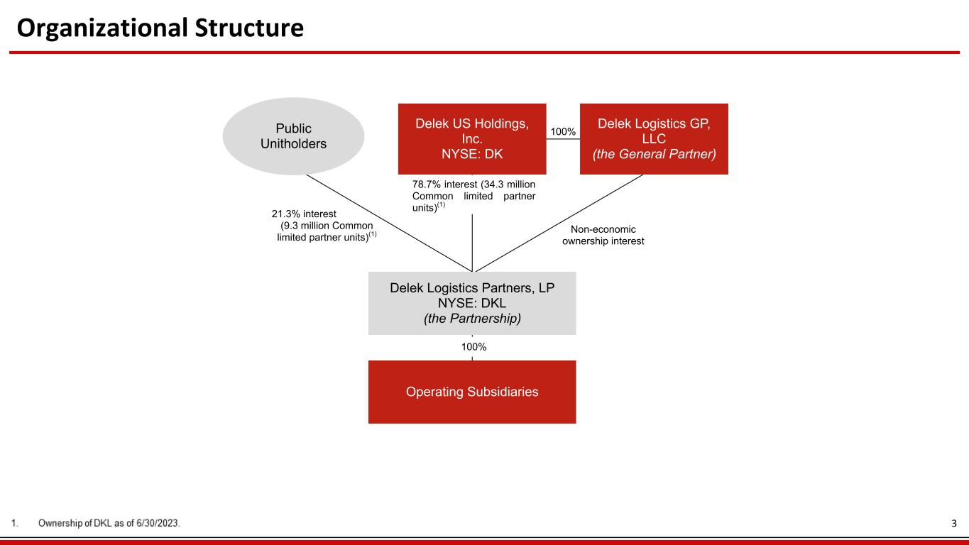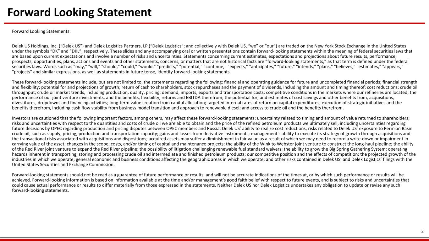 2 Forward Looking Statement Forward Looking Statements: Delek US Holdings, Inc. (“Delek US”) and Delek Logistics Partners, LP (“Delek Logistics”; and collectively with Delek US, “we” or “our”) are traded on the New York Stock Exchange in the United States under the symbols “DK” and ”DKL”, respectively. These slides and any accompanying oral or written presentations contain forward-looking statements within the meaning of federal securities laws that are based upon current expectations and involve a number of risks and uncertainties. Statements concerning current estimates, expectations and projections about future results, performance, prospects, opportunities, plans, actions and events and other statements, concerns, or matters that are not historical facts are “forward-looking statements,” as that term is defined under the federal securities laws. Words such as "may," "will," "should," "could," "would," "predicts," "potential," "continue," "expects," "anticipates," "future," "intends," "plans," "believes," "estimates," "appears," "projects" and similar expressions, as well as statements in future tense, identify forward-looking statements. These forward-looking statements include, but are not limited to, the statements regarding the following: financial and operating guidance for future and uncompleted financial periods; financial strength and flexibility; potential for and projections of growth; return of cash to shareholders, stock repurchases and the payment of dividends, including the amount and timing thereof; cost reductions; crude oil throughput; crude oil market trends, including production, quality, pricing, demand, imports, exports and transportation costs; competitive conditions in the markets where our refineries are located; the performance of our joint venture investments, and the benefits, flexibility, returns and EBITDA therefrom; the potential for, and estimates of cost savings and other benefits from, acquisitions, divestitures, dropdowns and financing activities; long-term value creation from capital allocation; targeted internal rates of return on capital expenditures; execution of strategic initiatives and the benefits therefrom, including cash flow stability from business model transition and approach to renewable diesel; and access to crude oil and the benefits therefrom. Investors are cautioned that the following important factors, among others, may affect these forward-looking statements: uncertainty related to timing and amount of value returned to shareholders; risks and uncertainties with respect to the quantities and costs of crude oil we are able to obtain and the price of the refined petroleum products we ultimately sell, including uncertainties regarding future decisions by OPEC regarding production and pricing disputes between OPEC members and Russia; Delek US’ ability to realize cost reductions; risks related to Delek US’ exposure to Permian Basin crude oil, such as supply, pricing, production and transportation capacity; gains and losses from derivative instruments; management's ability to execute its strategy of growth through acquisitions and the transactional risks associated with acquisitions and dispositions; acquired assets may suffer a diminishment in fair value as a result of which we may need to record a write-down or impairment in carrying value of the asset; changes in the scope, costs, and/or timing of capital and maintenance projects; the ability of the Wink to Webster joint venture to construct the long-haul pipeline; the ability of the Red River joint venture to expand the Red River pipeline; the possibility of litigation challenging renewable fuel standard waivers; the ability to grow the Big Spring Gathering System; operating hazards inherent in transporting, storing and processing crude oil and intermediate and finished petroleum products; our competitive position and the effects of competition; the projected growth of the industries in which we operate; general economic and business conditions affecting the geographic areas in which we operate; and other risks contained in Delek US’ and Delek Logistics’ filings with the United States Securities and Exchange Commission. Forward-looking statements should not be read as a guarantee of future performance or results, and will not be accurate indications of the times at, or by which such performance or results will be achieved. Forward-looking information is based on information available at the time and/or management’s good faith belief with respect to future events, and is subject to risks and uncertainties that could cause actual performance or results to differ materially from those expressed in the statements. Neither Delek US nor Delek Logistics undertakes any obligation to update or revise any such forward-looking statements.