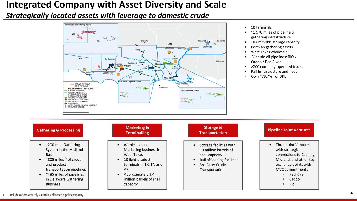 3 Organizational Structure 21.3% interest (9.3 million Common limited partner units)(1) 100% Delek Logistics Partners, LP NYSE: DKL (the Partnership) Public Unitholders Operating Subsidiaries 78.7% interest (34.3 million Common limited partner units)(1) Delek Logistics GP, LLC (the General Partner) Delek US Holdings, Inc. NYSE: DK Non-economic ownership interest 100%