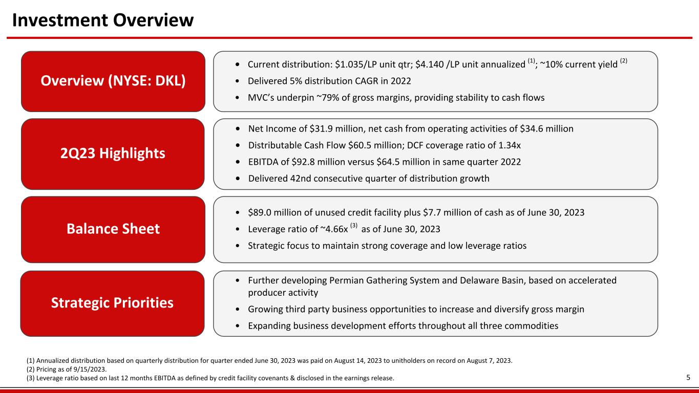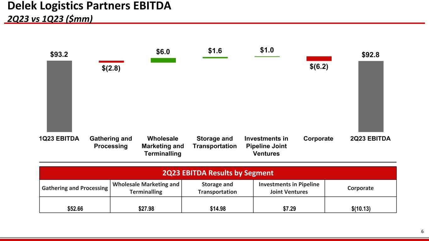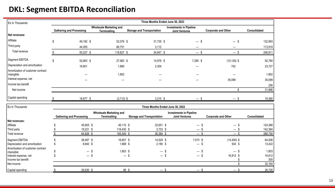 DKL: Segment EBITDA Reconciliation $'s In Thousands Three Months Ended June 30, 2023 Gathering and Processing Wholesale Marketing and Terminalling Storage and Transportation Investments in Pipeline Joint Ventures Corporate and Other Consolidated Net revenues: Affiliate $ 49,182 $ 52,076 $ 31,735 $ — $ — $ 132,993 Third party 44,055 66,751 3,112 — — 113,918 Total revenue $ 93,237 $ 118,827 $ 34,847 $ — $ — $ 246,911 Segment EBITDA $ 52,663 $ 27,983 $ 14,978 $ 7,285 $ (10,129) $ 92,780 Depreciation and amortization 18,801 1,880 2,304 — 742 23,727 Amortization of customer contract intangible — 1,802 — — — 1,802 Interest expense, net — — — — 35,099 35,099 Income tax benefit 256 Net income $ 31,896 Capital spending $ 18,877 $ (2,712) $ 3,215 $ — $ — $ 19,380 $'s In Thousands Three Months Ended June 30, 2022 Gathering and Processing Wholesale Marketing and Terminalling Storage and Transportation Investments in Pipeline Joint Ventures Corporate and Other Consolidated Net revenues: Affiliate $ 45,605 $ 46,110 $ 32,651 $ — $ — $ 124,366 Third party $ 19,221 $ 119,430 $ 3,733 $ — $ — $ 142,384 Total revenue $ 64,826 $ 165,540 $ 36,384 $ — $ — $ 266,750 Segment EBITDA $ 38,497 $ 18,807 $ 14,529 $ 7,073 $ (14,400) $ 64,506 Depreciation and amortization $ 8,640 $ 1,668 $ 2,180 $ — $ 934 $ 13,422 Amortization of customer contract intangible $ — $ 1,803 $ — $ — $ — $ 1,803 Interest expense, net $ — $ — $ — $ — $ 16,812 $ 16,812 Income tax benefit $ 305 Net income $ 32,164 Capital spending $ 26,630 $ 96 $ — $ — $ — $ 26,726 13