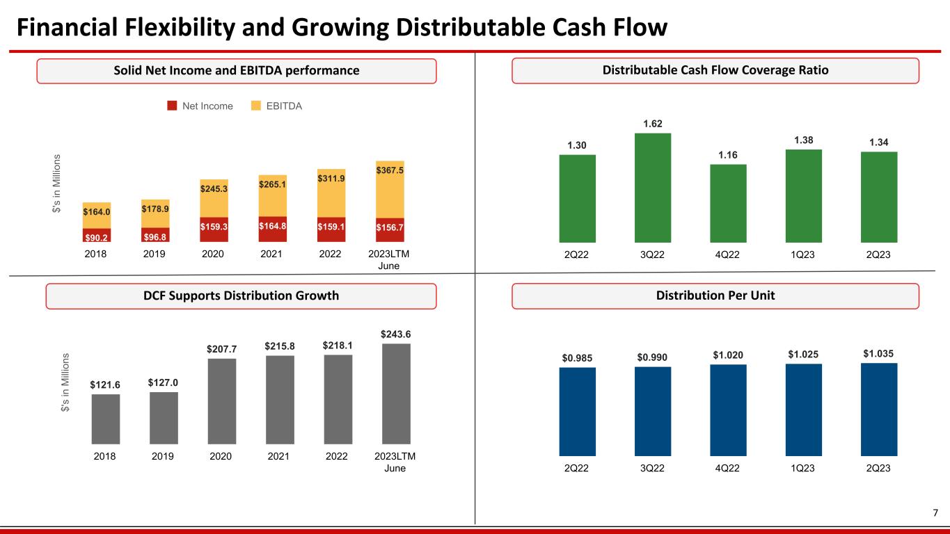 (1)Solid Net Income and EBITDA performance DCF Supports Distribution Growth Distributable Cash Flow Coverage Ratio Financial Flexibility and Growing Distributable Cash Flow $' s in M ill io ns $90.2 $96.8 $159.3 $164.8 $159.1 $156.7 $164.0 $178.9 $245.3 $265.1 $311.9 $367.5 Net Income EBITDA 2018 2019 2020 2021 2022 2023LTM June $' s in M ill io ns $121.6 $127.0 $207.7 $215.8 $218.1 $243.6 2018 2019 2020 2021 2022 2023LTM June Distribution Per Unit 1.30 1.62 1.16 1.38 1.34 2Q22 3Q22 4Q22 1Q23 2Q23 $0.985 $0.990 $1.020 $1.025 $1.035 2Q22 3Q22 4Q22 1Q23 2Q23 7