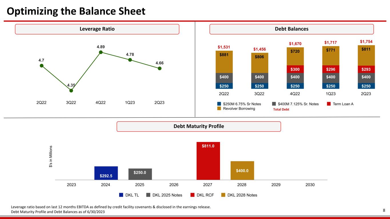 (1) Optimizing the Balance Sheet 4.7 4.35 4.89 4.78 4.66 2Q22 3Q22 4Q22 1Q23 2Q23 Leverage Ratio Debt Maturity Profile Debt Balances 8 Leverage ratio based on last 12 months EBITDA as defined by credit facility covenants & disclosed in the earnings release. Debt Maturity Profile and Debt Balances as of 6/30/2023 $' s in M illi on s $292.5 $250.0 $811.0 $400.0 DKL TL DKL 2025 Notes DKL RCF DKL 2028 Notes 2023 2024 2025 2026 2027 2028 2029 2030 $1,531 $1,456 $1,670 $1,717 $1,754 $250 $250 $250 $250 $250 $400 $400 $400 $400 $400 $300 $296 $293 $881 $806 $720 $771 $811 $250M 6.75% Sr Notes $400M 7.125% Sr. Notes Term Loan A Revolver Borrowing 2Q22 3Q22 4Q22 1Q23 2Q23 Total Debt