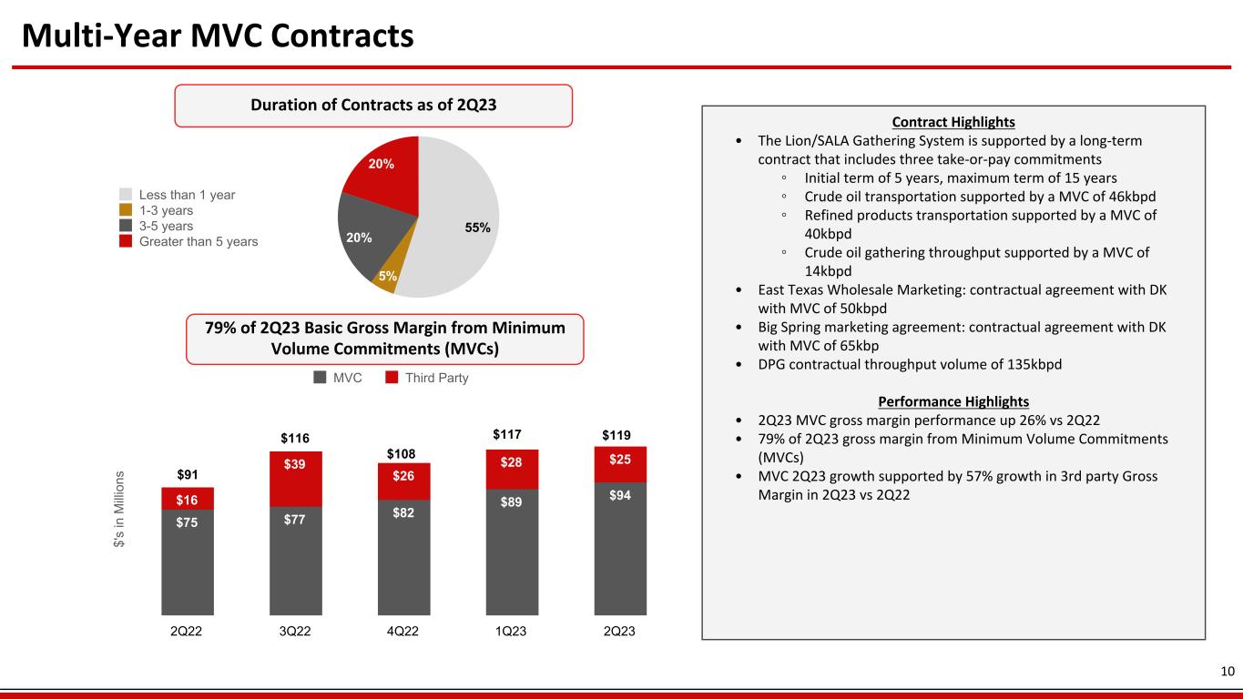 79% of 2Q23 Basic Gross Margin from Minimum Volume Commitments (MVCs) Duration of Contracts as of 2Q23 Multi-Year MVC Contracts Contract Highlights • The Lion/SALA Gathering System is supported by a long-term contract that includes three take-or-pay commitments ◦ Initial term of 5 years, maximum term of 15 years ◦ Crude oil transportation supported by a MVC of 46kbpd ◦ Refined products transportation supported by a MVC of 40kbpd ◦ Crude oil gathering throughput supported by a MVC of 14kbpd • East Texas Wholesale Marketing: contractual agreement with DK with MVC of 50kbpd • Big Spring marketing agreement: contractual agreement with DK with MVC of 65kbp • DPG contractual throughput volume of 135kbpd Performance Highlights • 2Q23 MVC gross margin performance up 26% vs 2Q22 • 79% of 2Q23 gross margin from Minimum Volume Commitments (MVCs) • MVC 2Q23 growth supported by 57% growth in 3rd party Gross Margin in 2Q23 vs 2Q22 $' s in M ill io ns $75 $77 $82 $89 $94$16 $39 $26 $28 $25 MVC Third Party 2Q22 3Q22 4Q22 1Q23 2Q23 $117 $91 $119 $108 $116 55% 5% 20% 20% Less than 1 year 1-3 years 3-5 years Greater than 5 years 10