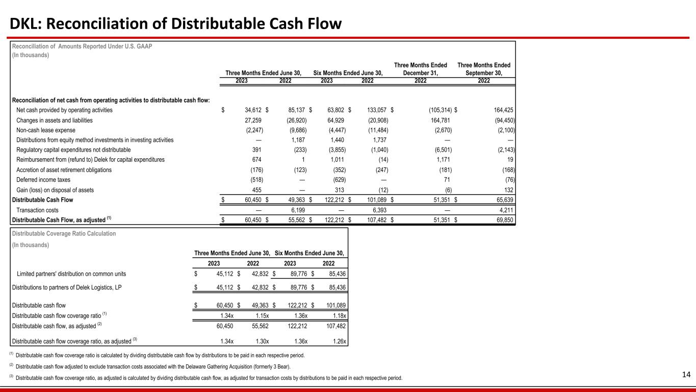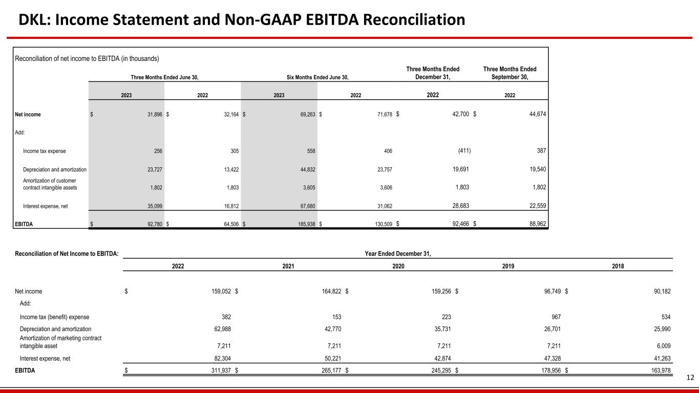 DKL: Income Statement and Non-GAAP EBITDA Reconciliation Reconciliation of net income to EBITDA (in thousands) Three Months Ended June 30, Six Months Ended June 30, Three Months Ended December 31, Three Months Ended September 30, 2023 2022 2023 2022 2022 2022 Net income $ 31,896 $ 32,164 $ 69,263 $ 71,678 $ 42,700 $ 44,674 Add: Income tax expense 256 305 558 406 (411) 387 Depreciation and amortization 23,727 13,422 44,832 23,757 19,691 19,540 Amortization of customer contract intangible assets 1,802 1,803 3,605 3,606 1,803 1,802 Interest expense, net 35,099 16,812 67,680 31,062 28,683 22,559 EBITDA $ 92,780 $ 64,506 $ 185,938 $ 130,509 $ 92,466 $ 88,962 12 Reconciliation of Net Income to EBITDA: Year Ended December 31, 2022 2021 2020 2019 2018 Net income $ 159,052 $ 164,822 $ 159,256 $ 96,749 $ 90,182 Add: Income tax (benefit) expense 382 153 223 967 534 Depreciation and amortization 62,988 42,770 35,731 26,701 25,990 Amortization of marketing contract intangible asset 7,211 7,211 7,211 7,211 6,009 Interest expense, net 82,304 50,221 42,874 47,328 41,263 EBITDA $ 311,937 $ 265,177 $ 245,295 $ 178,956 $ 163,978