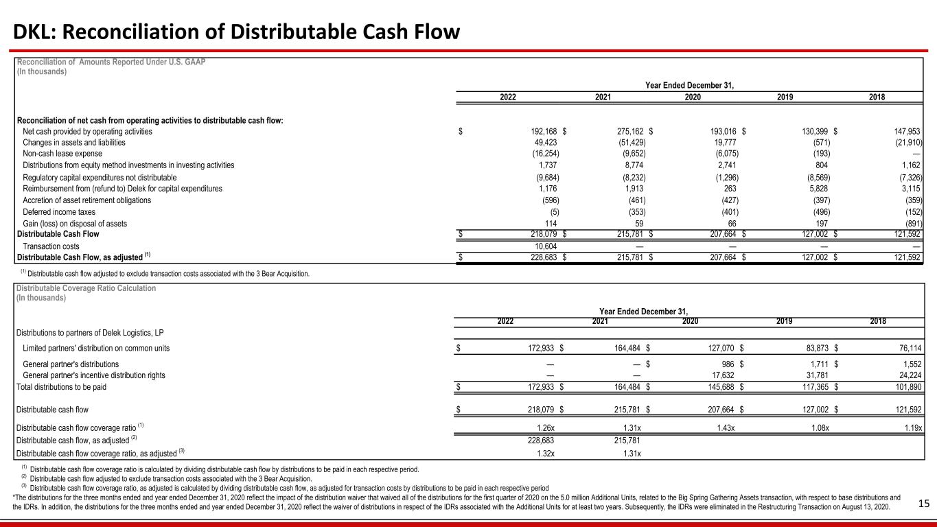 15 (1) Distributable cash flow coverage ratio is calculated by dividing distributable cash flow by distributions to be paid in each respective period. (2) Distributable cash flow adjusted to exclude transaction costs associated with the 3 Bear Acquisition. (3) Distributable cash flow coverage ratio, as adjusted is calculated by dividing distributable cash flow, as adjusted for transaction costs by distributions to be paid in each respective period *The distributions for the three months ended and year ended December 31, 2020 reflect the impact of the distribution waiver that waived all of the distributions for the first quarter of 2020 on the 5.0 million Additional Units, related to the Big Spring Gathering Assets transaction, with respect to base distributions and the IDRs. In addition, the distributions for the three months ended and year ended December 31, 2020 reflect the waiver of distributions in respect of the IDRs associated with the Additional Units for at least two years. Subsequently, the IDRs were eliminated in the Restructuring Transaction on August 13, 2020. DKL: Reconciliation of Distributable Cash Flow Distributable Coverage Ratio Calculation (In thousands) Year Ended December 31, 2022 2021 2020 2019 2018 Distributions to partners of Delek Logistics, LP Limited partners' distribution on common units $ 172,933 $ 164,484 $ 127,070 $ 83,873 $ 76,114 General partner's distributions — — $ 986 $ 1,711 $ 1,552 General partner's incentive distribution rights — — 17,632 31,781 24,224 Total distributions to be paid $ 172,933 $ 164,484 $ 145,688 $ 117,365 $ 101,890 Distributable cash flow $ 218,079 $ 215,781 $ 207,664 $ 127,002 $ 121,592 Distributable cash flow coverage ratio (1) 1.26x 1.31x 1.43x 1.08x 1.19x Distributable cash flow, as adjusted (2) 228,683 215,781 Distributable cash flow coverage ratio, as adjusted (3) 1.32x 1.31x Reconciliation of Amounts Reported Under U.S. GAAP (In thousands) Year Ended December 31, 2022 2021 2020 2019 2018 Reconciliation of net cash from operating activities to distributable cash flow: Net cash provided by operating activities $ 192,168 $ 275,162 $ 193,016 $ 130,399 $ 147,953 Changes in assets and liabilities 49,423 (51,429) 19,777 (571) (21,910) Non-cash lease expense (16,254) (9,652) (6,075) (193) — Distributions from equity method investments in investing activities 1,737 8,774 2,741 804 1,162 Regulatory capital expenditures not distributable (9,684) (8,232) (1,296) (8,569) (7,326) Reimbursement from (refund to) Delek for capital expenditures 1,176 1,913 263 5,828 3,115 Accretion of asset retirement obligations (596) (461) (427) (397) (359) Deferred income taxes (5) (353) (401) (496) (152) Gain (loss) on disposal of assets 114 59 66 197 (891) Distributable Cash Flow $ 218,079 $ 215,781 $ 207,664 $ 127,002 $ 121,592 Transaction costs 10,604 — — — — Distributable Cash Flow, as adjusted (1) $ 228,683 $ 215,781 $ 207,664 $ 127,002 $ 121,592 (1) Distributable cash flow adjusted to exclude transaction costs associated with the 3 Bear Acquisition.