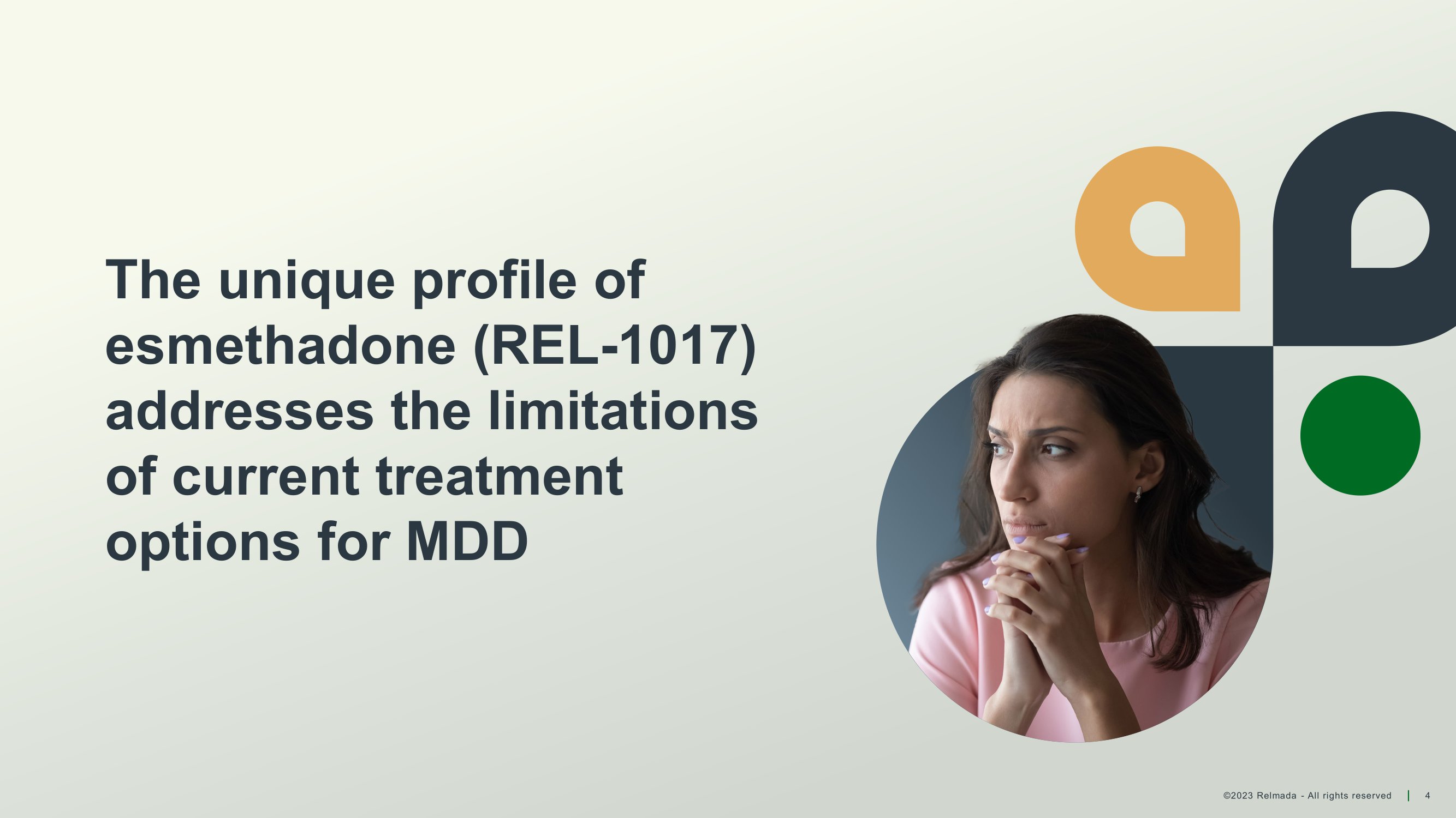 ©2023 Relmada - All rights reserved Unique profile of esmethadone (REL - 1017) addresses limitations of current treatments Potential as a rapid, oral, once - daily antidepressant for MDD, if approved 7 MDD = major depressive disorder; NMDAR = N - methyl - D - aspartate receptor 1. Bettini E al. Pharmacological Comparative Characterization of REL - 1017 (Esmethadone - HCl) and Other NMDAR Channel Blockers in Human Heterodimeric N - Methyl - D - Aspartate Receptors. Pharmaceuticals (Basel). 2022;15(8):997; 2. Bettini E et al. The N - Methyl - D - Aspartate Receptor Blocker REL - 1017 (Esmethadone) Reduces Calcium Influx Induced by Glutamate, Quinolinic Acid, and Gentamicin. Pharmaceuticals (Basel). 2022;15(7):882; 3. Stahl SM et al. Esmethadone (REL - 1017) and Other Uncompetitive NMDAR Channel Blockers May Improve Mood Disorders via Modulation of Synaptic Kinase - Mediated Signaling. Int J Mol Sci. 2022;23(20); 4. Fava M et al. REL - 1017 (Esmethadone) as Adjunctive Treatment in Patients With Major Depressive Disorder: A Phase 2a Randomized Double - Blind Trial. Am J Psychiatry. 2022;179(2):122 - 131; 5. Bernstein et al. Characterization of the Safety and Pharmacokinetic Profile of D - Methadone, a Novel N - Methyl - D - Aspartate Receptor Antagonist in Healthy, Opioid - Naive Subjects: Results of Two Phase 1 Studies. J Clin Psychopharmacol. 2019;39(3):226 - 237; 6. Relmada data on file Clinical data has demonstrated: • Robust, rapid, and sustained statistically significant antidepressant effects on all tested scales 4 • Rapid onset: significant efficacy effects by Day 4 4 • Favorable safety and tolerability profile consistent across all studies 4,5,6 : no opioid and no psychotomimetic adverse events and no metabolic side effects 4,5,6 • Orally administered, once - daily tablet Novel Mechanism of Action: preferential targeting of NMDAR channels potentially associated with MDD 1,2,3