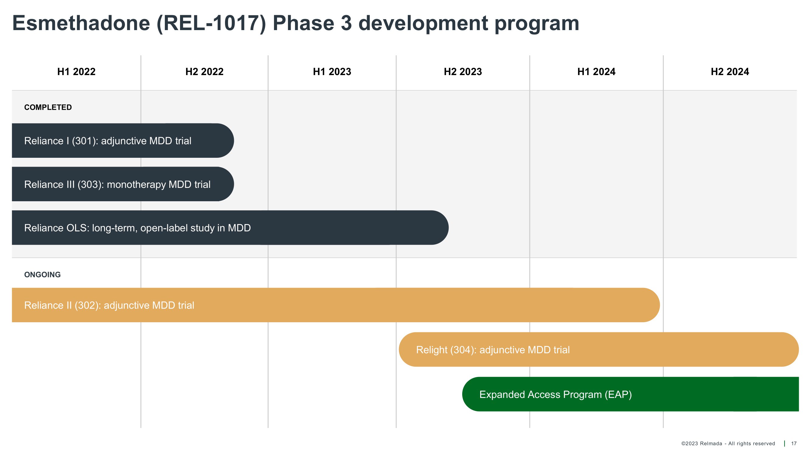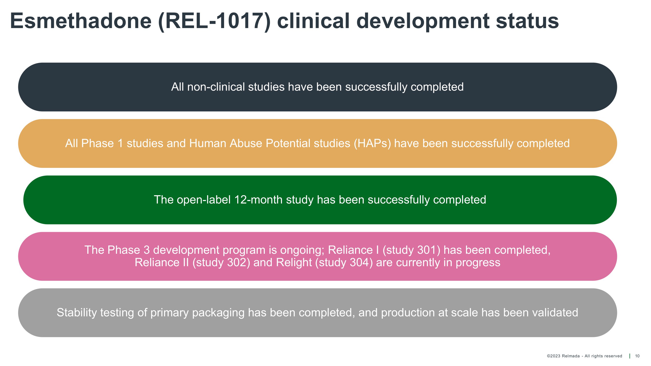 ©2023 Relmada - All rights reserved 9 The clinical development of esmethadone (REL - 1017) is steadily progressing as Adjunctive Treatment for MDD