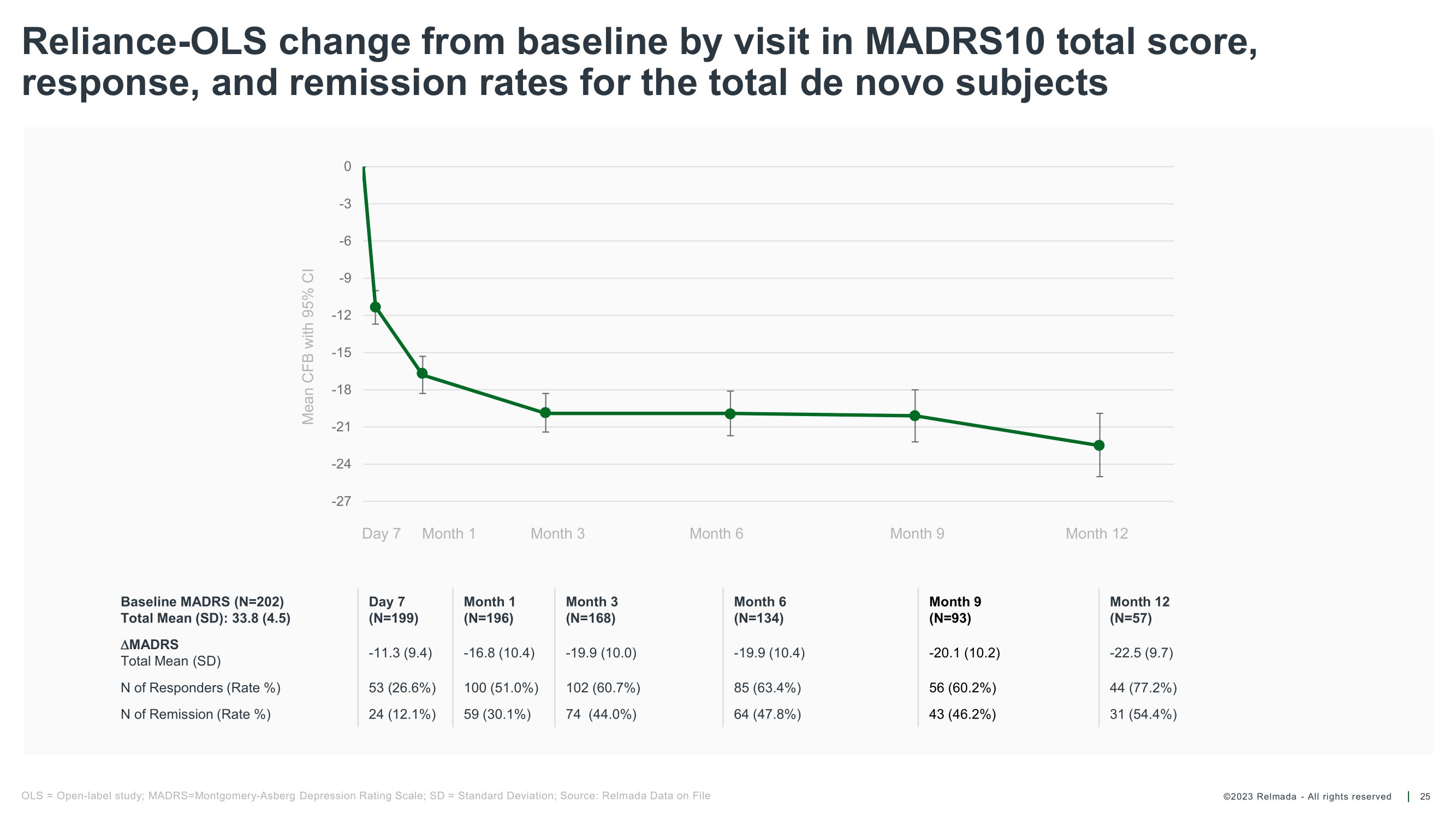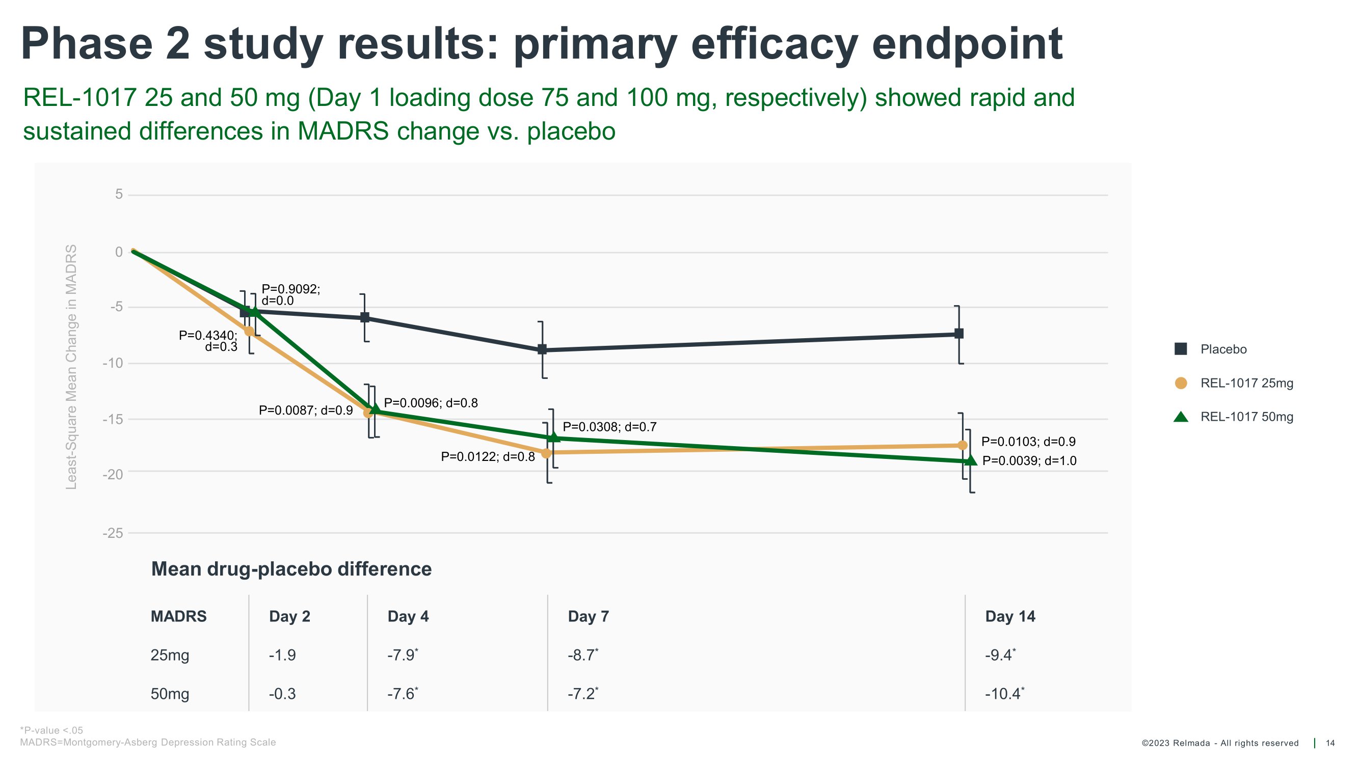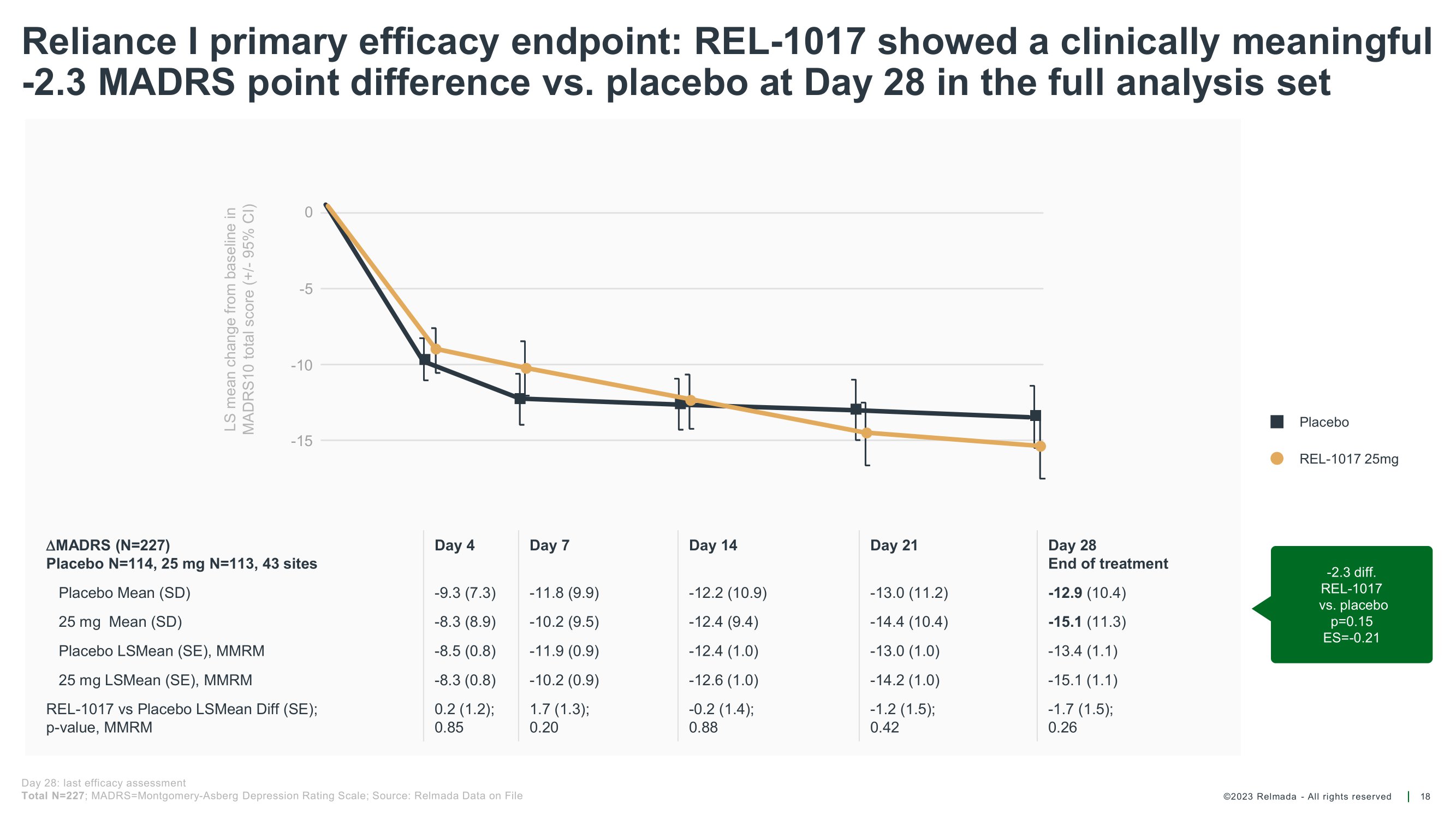 ©2023 Relmada - All rights reserved Baseline/ Day 1 Day 4 Day 7 Day 14 Day 21 Day 28 Reliance I MADRS10 results for patients from verifiable sources vs unverifiable sources 22 49 49 50 50 50 52 REL 37 37 39 39 39 40 PLA Average change from baseline on Day 28 REL - 1017 - 17.22 PLACEBO - 11.76 p = 0.58911 - 13.22 REL - 1017 Average change from baseline on Day 28 - 14.31 PLACEBO Mean MADRS10 score Mean MADRS10 score Baseline/ Day 4 Day 1 Day 7 Day 14 Day 21 Day 28 60 59 60 60 61 61 REL 70 65 66 70 70 74 PLA P - values are calculated using Student's Two - sample equal variance t - Test, with a two - tailed distribution 0 5 10 15 20 25 30 35 40 Patients from verifiable sources REL PLA p = 0.01614 - 5.5 diff. REL - 1017 vs. placebo 0 5 10 15 20 25 30 35 40 Patients from unverifiable sources REL PLA