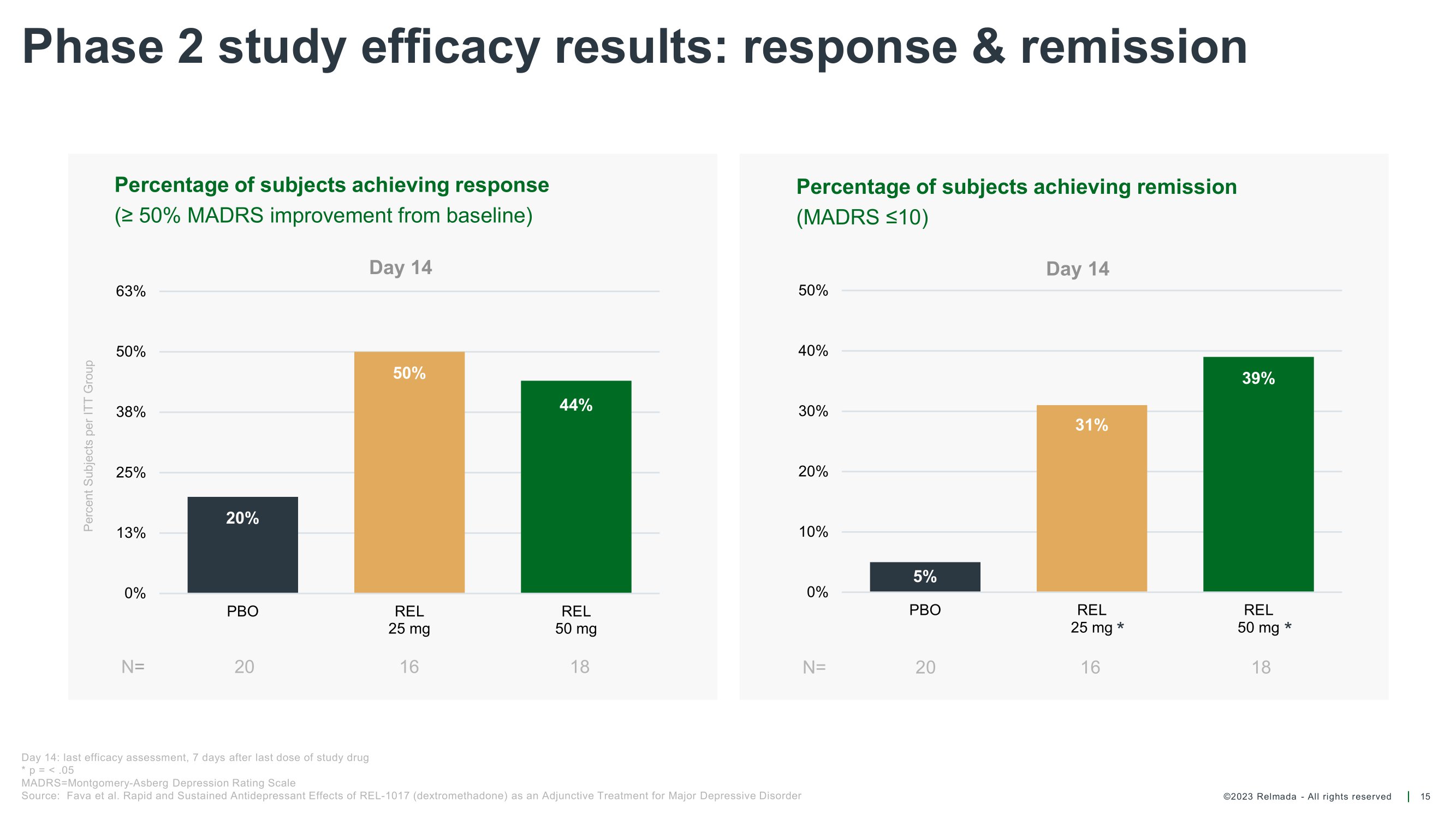 ©2023 Relmada - All rights reserved Phase 2 study efficacy results: response & remission 15 50% 44% 20% 0% 13% 25% 38% 50% 63% PBO REL 25 mg REL 50 mg Day 14 Percent Subjects per ITT Group Percentage of subjects achieving response (≥ 50% MADRS improvement from baseline) N = 20 16 18 5% 31% 39% 0% 10% 20% 30% 40% PBO Percentage of subjects achieving remission (MADRS ≤10) Day 14 50% N= 20 REL 25 mg * 16 REL 50 mg * 18 Day 14: last efficacy assessment, 7 days after last dose of study drug * p = < .05 MADRS=Montgomery - Asberg Depression Rating Scale Source: Fava et al. Rapid and Sustained Antidepressant Effects of REL - 1017 (dextromethadone) as an Adjunctive Treatment for Major Depressive Disorder