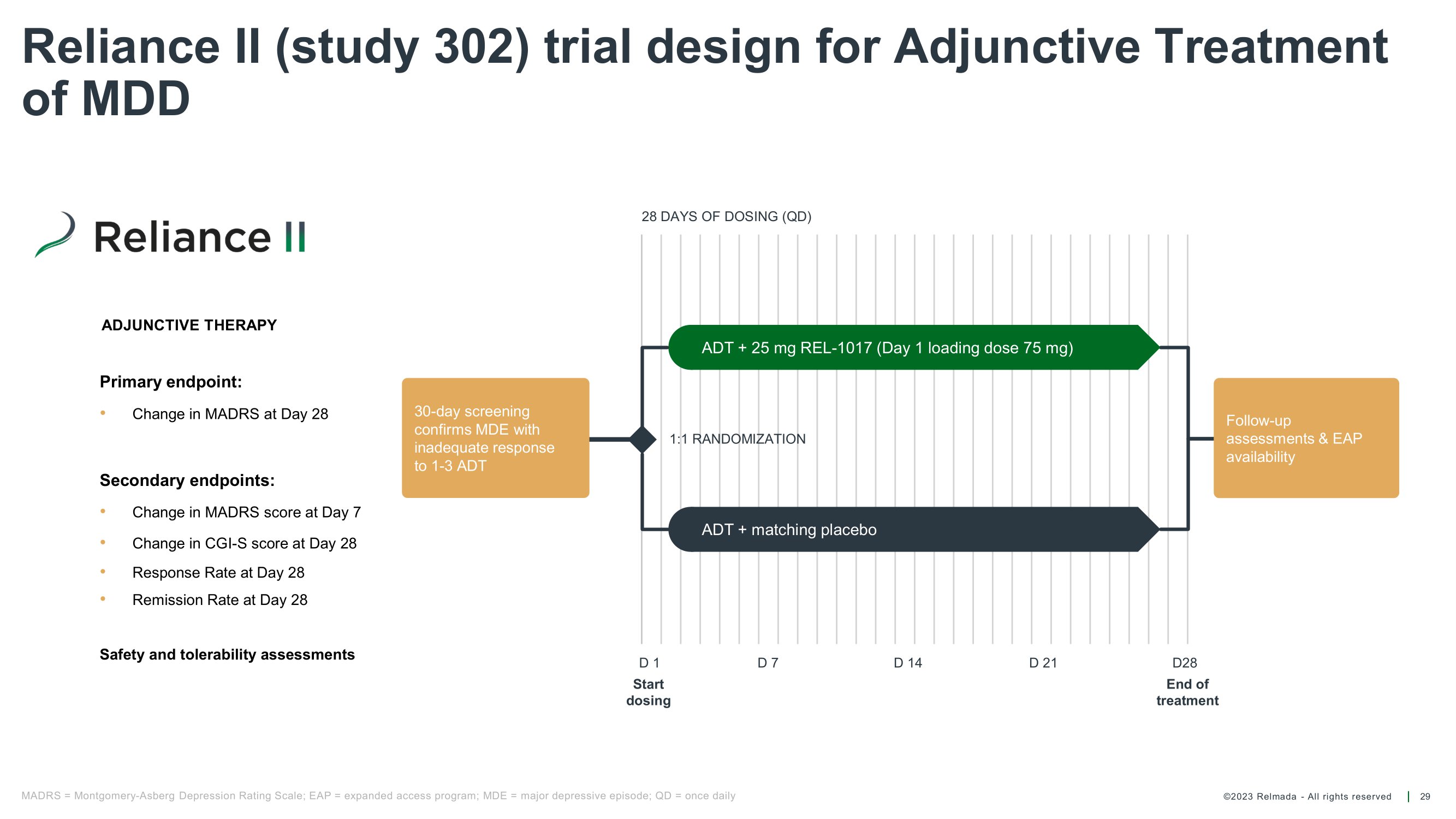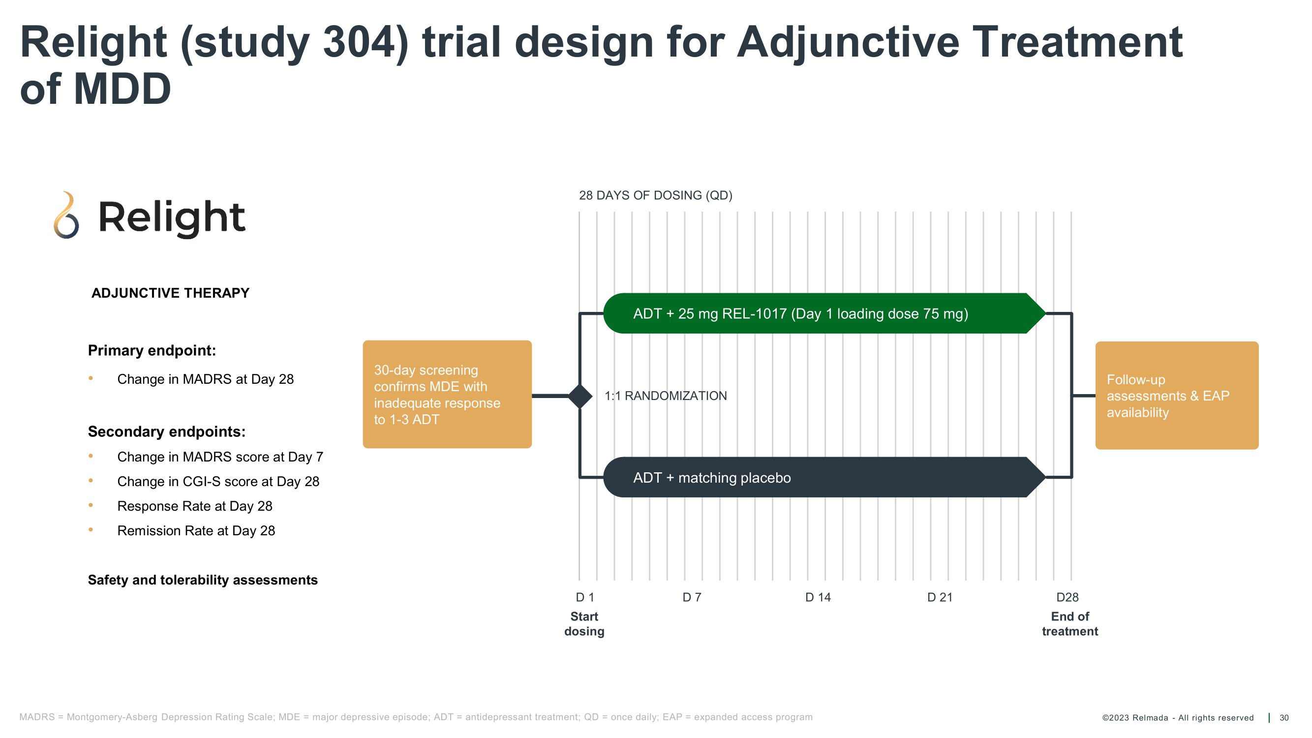©2023 Relmada - All rights reserved Reliance II (study 302) trial design for Adjunctive Treatment of MDD 29 Follow - up assessments & EAP availability ADT + matching placebo ADT + 25 mg REL - 1017 (Day 1 loading dose 75 mg) 1:1 RANDOMIZATION 28 DAYS OF DOSING (QD) D 1 Start dosing D 7 D 14 D28 End of treatment D 21 MADRS = Montgomery - Asberg Depression Rating Scale; EAP = expanded access program; MDE = major depressive episode; QD = once daily 30 - day screening confirms MDE with inadequate response to 1 - 3 ADT Primary endpoint: • Change in MADRS at Day 28 Secondary endpoints: • Change in MADRS score at Day 7 • Change in CGI - S score at Day 28 • Response Rate at Day 28 • Remission Rate at Day 28 Safety and tolerability assessments ADJUNCTIVE THERAPY