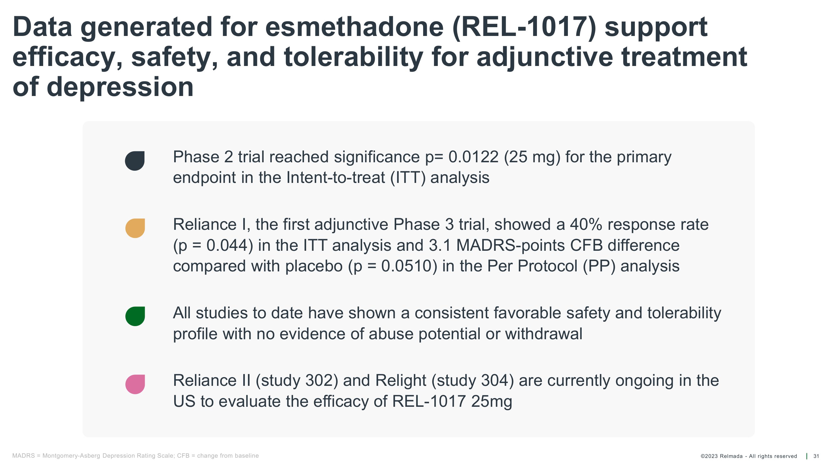 ©2023 Relmada - All rights reserved 27 Relmada is conducting two Phase 3 trials Phase 3 studies, currently ongoing in the United States, to evaluate the efficacy and safety of REL - 1017 as an adjunctive treatment for MDD