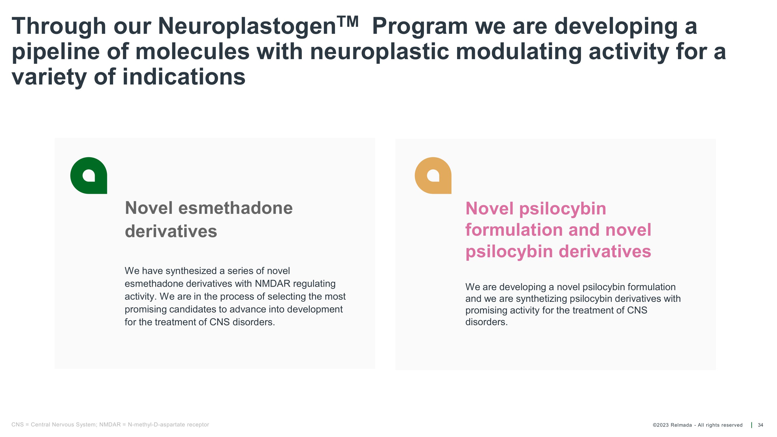 ©2023 Relmada - All rights reserved Through our Neuroplastogen TM Program we are developing a pipeline of molecules with neuroplastic modulating activity for a variety of indications 34 Novel esmethadone derivatives We have synthesized a series of novel esmethadone derivatives with NMDAR regulating activity. We are in the process of selecting the most promising candidates to advance into development for the treatment of CNS disorders. CNS = Central Nervous System; NMDAR = N - methyl - D - aspartate receptor Novel psilocybin formulation and novel psilocybin derivatives We are developing a novel psilocybin formulation and we are synthetizing psilocybin derivatives with promising activity for the treatment of CNS disorders.