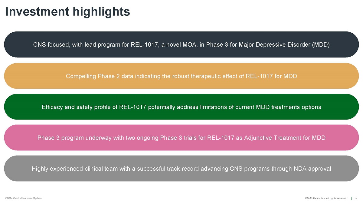 ©2023 Relmada - All rights reserved D i sc lo s u r es 2 Certain statements contained in this presentation or in other documents of Relmada Therapeutics, Inc . (the “Company”), along with certain statements that may be made by management of the Company orally in presenting this material, may contain “forward - looking statements . ” These statements can be identified by the fact that they do not relate strictly to historic or current facts . They use words such as “estimate,” “expect,” “intend,” “believe,” “plan,” “anticipate,” “projected” and other words and terms of similar meaning in connection with any discussion of future operating or financial performance or condition . These statements are based upon the current beliefs and expectations of the Company’s management and are subject to significant risks, uncertainties , and assumptions that could cause actual results to differ materially from those described in the forward - looking statements, including potential failure of clinical trial results to demonstrate statistically and/or clinically significant evidence of efficacy and/or safety, failure of top - line results to accurately reflect the complete results of the trial, failure of the 310 open - label study to accurately reflect the results of the ongoing 302 and 304 blinded, randomized and controlled studies, failure to obtain regulatory approval of REL - 1017 for the treatment of major depressive disorder, and the other risk factors described under the heading "Risk Factors" set forth in the Company's reports filed with the SEC from time to time . Statements regarding future action, future performance and/or future results, those relating to the timing for completion, and results of, scheduled or additional clinical trials and the FDA’s or other regulatory review and/or approval and commercial launch and sales results (if any) of the Company’s formulations and products and regulatory filings related to the same may differ from those set forth in the forward - looking statements . Peak sales and market size estimates have been determined on the basis of market research and comparable product analysis, but no assurances can be given that such sales levels will be achieved, if at all, or that such market size estimates will prove accurate . Because actual results are affected by these and other potential risks, contingencies and uncertainties, the Company cautions investors that actual results may differ materially from those expressed or implied in any forward - looking statement . It is not possible to predict or identify all such risks, contingencies and uncertainties . The Company identifies some of these factors in its Securities and Exchange Commission (“SEC”) filings on Forms 10 - K, 10 - Q and 8 - K, and investors are advised to consult the Company’s filings for a more complete listing of risk factors, contingencies and uncertainties affecting the Company and its business and financial performance . The Company assumes no obligation to update forward - looking statements as circumstances change . Investors are advised to consult further disclosures that the Company makes or has made on related subjects in the Company’s Form 10 - K, 10 - Q and 8 - K reports .