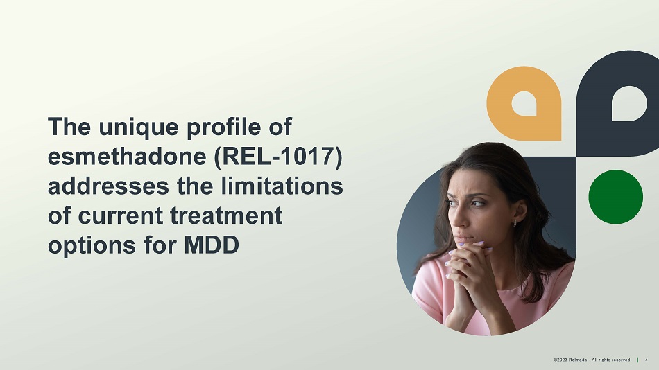 ©2023 Relmada - All rights reserved 4 The unique profile of esmethadone (REL - 1017) addresses the limitations of current treatment options for MDD