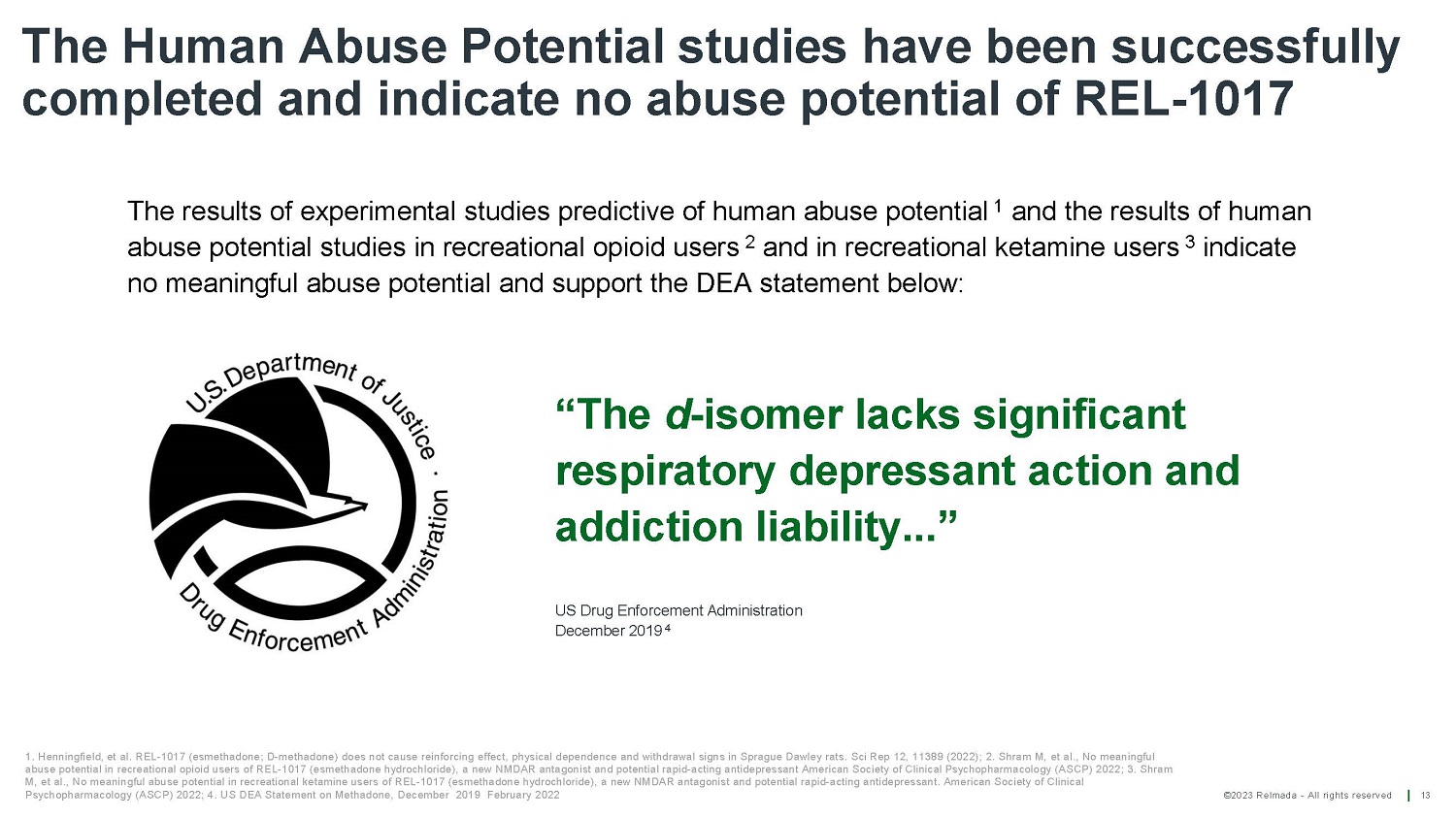 ©2023 Relmada - All rights reserved The Human Abuse Potential studies have been successfully completed and indicate no abuse potential of REL - 1017 13 “The d - isomer lacks significant respiratory depressant action and addiction liability...” US Dr u g En f o r c e m en t Ad m i n i s t r at i on D e c e m be r 201 9 4 1. Henningfield, et al. REL - 1017 (esmethadone; D - methadone) does not cause reinforcing effect, physical dependence and withdrawal signs in Sprague Dawley rats. Sci Rep 12, 11389 (2022); 2. Shram M, et al., No meaningful abuse potential in recreational opioid users of REL - 1017 (esmethadone hydrochloride), a new NMDAR antagonist and potential rapid - acting antidepressant American Society of Clinical Psychopharmacology (ASCP) 2022; 3. Shram M, et al., No meaningful abuse potential in recreational ketamine users of REL - 1017 (esmethadone hydrochloride), a new NMDAR antagonist and potential rapid - acting antidepressant. American Society of Clinical Psychopharmacology (ASCP) 2022; 4. US DEA Statement on Methadone, December 2019 February 2022 The results of experimental studies predictive of human abuse potential 1 and the results of human abuse potential studies in recreational opioid users 2 and in recreational ketamine users 3 indicate no meaningful abuse potential and support the DEA statement below: