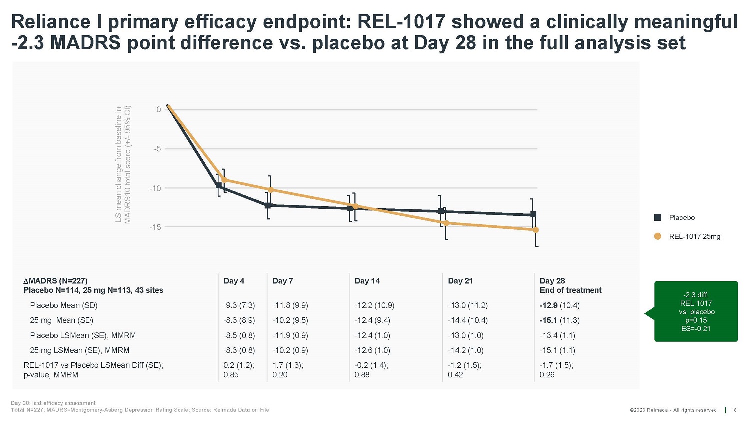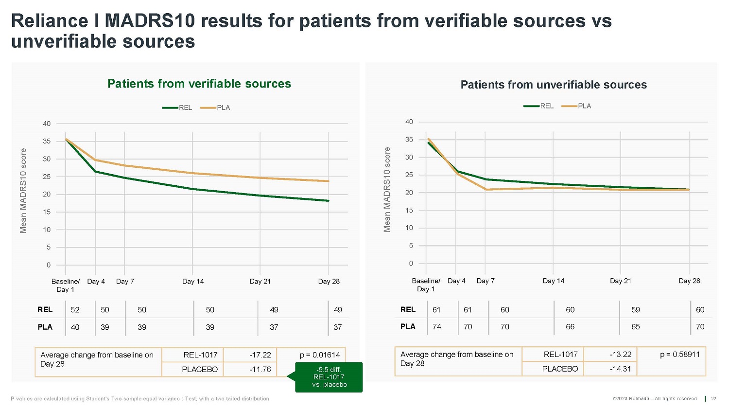 ©2023 Relmada - All rights reserved B a s eline/ Day 1 D ay 4 D ay 7 D ay 14 D ay 21 D ay 28 Reliance I MADRS10 results for patients from verifiable sources vs unverifiable sources 22 49 49 50 50 50 52 REL 37 37 39 39 39 40 PLA Average change from baseline on Day 28 REL - 1017 - 17.22 PLACEBO - 11.76 p = 0.58911 - 13.22 REL - 1017 Average change from baseline on Day 28 - 14.31 PLACEBO Mean MADRS10 score Mean MADRS10 score Baseline/ Day 4 Day 1 D ay 7 D ay 14 D ay 21 D ay 28 60 59 60 60 61 61 REL 70 65 66 70 70 74 PLA P - values are calculated using Student's Two - sample equal variance t - Test, with a two - tailed distribution 0 5 10 15 20 25 30 35 40 Patients from verifiable sources REL PLA p = 0.01614 - 5.5 diff. REL - 1017 v s . pla c ebo 0 5 10 15 20 25 30 35 40 Patients from unverifiable sources REL PLA