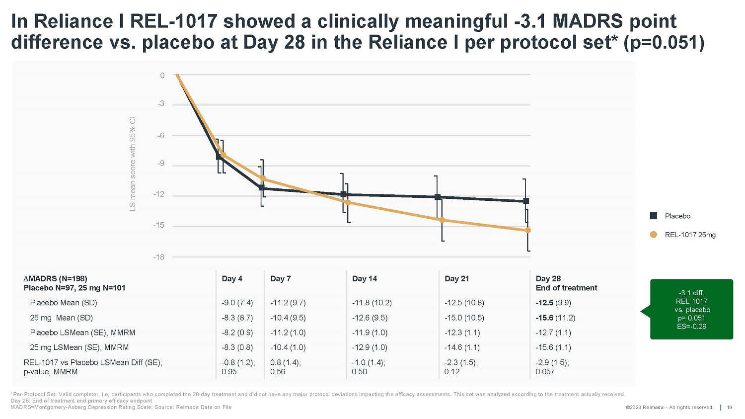 ©2023 Relmada - All rights reserved LS mean change from baseline in MADRS10 total score (+/ - 95% CI) 0 - 5 - 10 - 15 Reliance I primary efficacy endpoint: REL - 1017 showed a clinically meaningful - 2.3 MADRS point difference vs. placebo at Day 28 in the full analysis set 18 Day 28: last efficacy assessment Total N=227 ; MADRS=Montgomery - Asberg Depression Rating Scale; Source: Relmada Data on File Day 28 End of treatment Day 21 Day 14 Day 7 Day 4  MADRS (N=227) Placebo N=114, 25 mg N=113, 43 sites - 12.9 (10.4) - 13.0 (11.2) - 12.2 (10.9) - 11.8 (9.9) - 9.3 (7.3) Placebo Mean (SD) - 15.1 (11.3) - 14.4 (10.4) - 12.4 (9.4) - 10.2 (9.5) - 8.3 (8.9) 25 mg Mean (SD) - 13.4 (1.1) - 13.0 (1.0) - 12.4 (1.0) - 11.9 (0.9) - 8.5 (0.8) Placebo LSMean (SE), MMRM - 15.1 (1.1) - 14.2 (1.0) - 12.6 (1.0) - 10.2 (0.9) - 8.3 (0.8) 25 mg LSMean (SE), MMRM - 1.7 (1.5); 0.26 - 1.2 (1.5); 0.42 - 0.2 (1.4); 0.88 1.7 (1.3); 0.20 0.2 (1.2); 0.85 REL - 1017 vs Placebo LSMean Diff (SE); p - value, MMRM P la c ebo RE L - 1017 25 m g - 2.3 diff. RE L - 1017 v s . pla c ebo p=0.15 ES= - 0.21