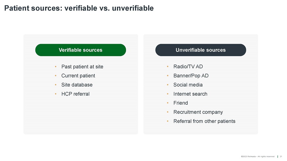 ©2023 Relmada - All rights reserved Patient sources: verifiable vs. unverifiable 21 Verifiable sources • Past patient at site • Current patient • Site database • HCP referral • R ad i o / T V AD • Banner/Pop AD • Social media • Internet search • Friend • Recruitment company • Referral from other patients Unverifiable sources
