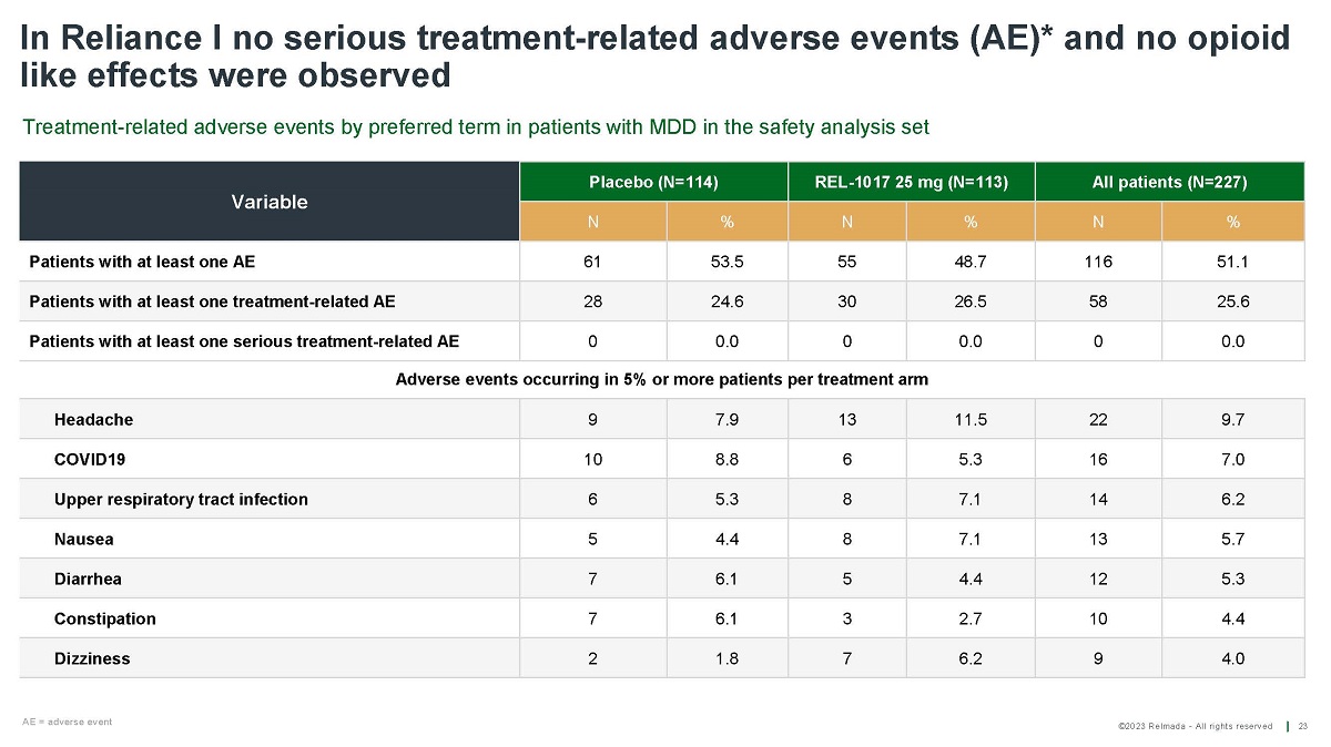 ©2023 Relmada - All rights reserved In Reliance I no serious treatment - related adverse events (AE)* and no opioid like effects were observed 23 All patients (N=227) REL - 1017 25 mg (N=113) Placebo (N=114) Variable % N % N % N 51.1 116 48.7 55 53.5 61 Patients with at least one AE 25.6 58 26.5 30 24.6 28 Patients with at least one treatment - related AE 0.0 0 0.0 0 0.0 0 Patients with at least one serious treatment - related AE 9.7 22 11.5 13 7.9 9 Headache 7.0 16 5.3 6 8.8 10 COVID19 6.2 14 7.1 8 5.3 6 Upper respiratory tract infection 5.7 13 7.1 8 4.4 5 Nausea 5.3 12 4.4 5 6.1 7 Diarrhea 4.4 10 2.7 3 6.1 7 Constipation 4.0 9 6.2 7 1.8 2 Dizziness Adverse events occurring in 5% or more patients per treatment arm Treatment - related adverse events by preferred term in patients with MDD in the safety analysis set AE = adverse event