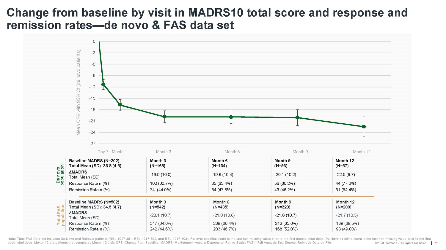 ©2023 Relmada - All rights reserved REL - 1017 displays a favorable safety & tolerability profile and confirms no evidence for meaningful abuse potential across studies 24 1. C - SSRS: Columbia Suicide Severity Rating Scale; 2. CADDS: Clinician - Administered Dissociative States Scale; 3. SOWS: Subjective Opioid Withdrawal Scale; 4. COWS: Clinical Opiate Withdrawal Scale; 5. PWC - 20: Physician Withdrawal Checklist; 6. MADDERS ® : Misuse, Abuse, and Diversion Drug Event Reporting System No AE related to QTcF prolongation No signal of drug induced suicidal ideation/behavior measured with C - SSRS 1 No signal of drug - induced dissociation measured with CADDS 2 No “drug liking” VAS differences from placebo No signal of withdrawal measured with SOWS 3 , COWS 4 and PWC - 20 5 No MADDERS ® reports of concern 6 C a r di ac safety No increase in suicidality No dissociative effects No abuse potential These Phase 3 results are consistent with safety and tolerability findings from the Phase 2 study