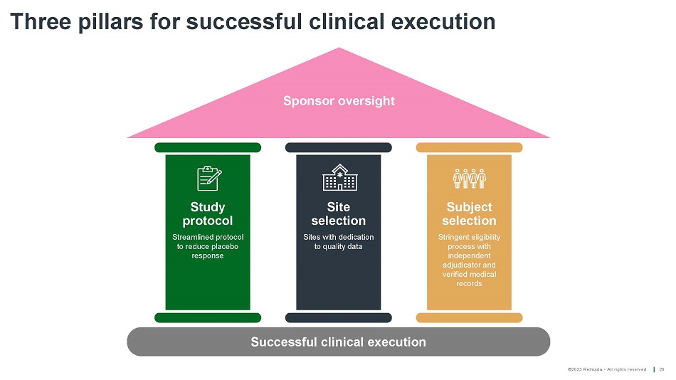 ©2023 Relmada - All rights reserved Three pillars for successful clinical execution 28 Successful clinical execution Sponsor oversight Study p r oto c ol Streamlined protocol to reduce placebo response Site se l ec tion Sites with dedication to quality data Subject se l ec tion S t r i n g en t e li g i b ili ty process with independent adjudicator and verified medical records