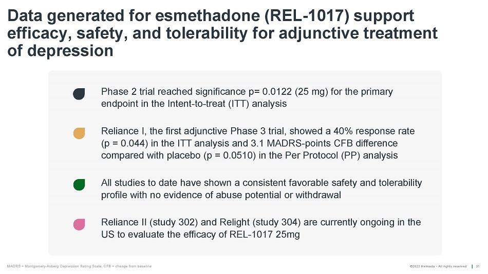©2023 Relmada - All rights reserved 27 Relmada is conducting two Phase 3 trials Phase 3 studies, currently ongoing in the United States, to evaluate the efficacy and safety of REL - 1017 as an adjunctive treatment for MDD