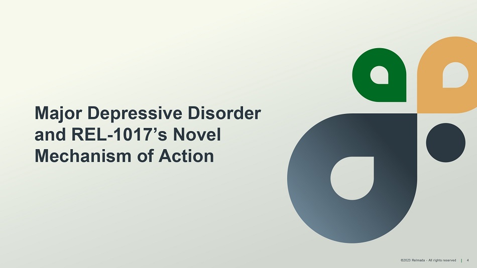 ©2023 Relmada - All rights reserved 4 Major Depressive Disorder and REL - 1017’s Novel Mechanism of Action