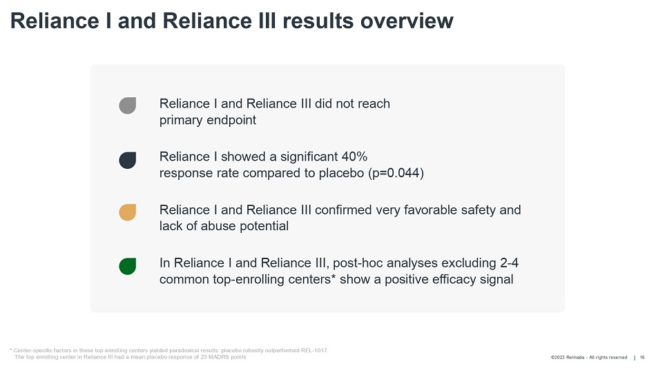 ©2023 Relmada - All rights reserved Randomized, two - arm, placebo - controlled pivotal study as a monotherapy treatment for patients with MDD. In patients experiencing an untreated MDE (patients receiving no ADT) Primary Endpoint: Change in MADRS at Day 28 Key Secondary Endpoints: • Change in CGI - S score at Day 28 • Change in MADRS score at Day 7 Randomized two - arm, placebo - controlled pivotal studies in patients with MDD and inadequate response to ongoing standard antidepressant treatment. These are two studies conducted one after the other. In MDD patients with inadequate response to 1 - 3 ADT in the current MDE Primary Endpoint: Change in MADRS at Day 28 Key Secondary Endpoints: • Change in CGI - S score at Day 28 • Change in MADRS score at Day 7 Long - term, open - label safety study. Patients continuing from Reliance I, II & III Patients new to REL - 1017 REL - 1017 phase 3 program for the treatment of MDD 15 MDD = major depressive disorder; ADT = antidepressant treatment ; OLS = open label study; MADRS = Montgomery - Asberg Depression Rating Scale; CGIs = Clinical Global Impression scales; MDE = major depressive episode Additional phase 3 MDD trials in preparation. +