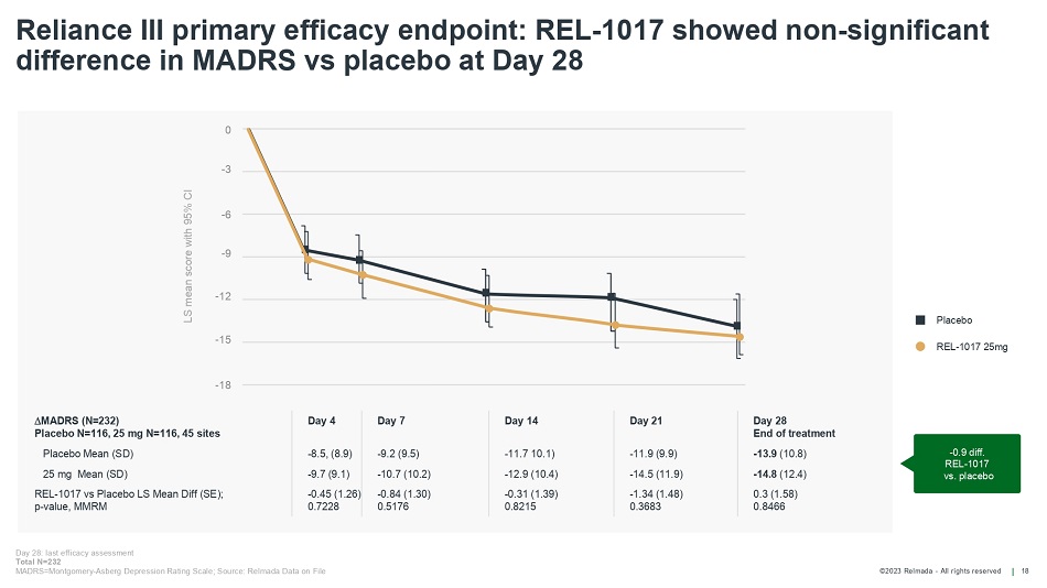 ©2023 Relmada - All rights reserved Pivotal phase 3 trial design for monotherapy 17 Follow - up assessments & Reliance OLS 1:1 RANDOMIZATION 28 DAYS OF DOSING (QD) Start dosing** D 1 D 4 D 7 D 14 D28 End of treatment D 21 25 mg REL - 1017 (Day 1 loading dose 75 mg) Placebo SAFER INTERVIEW* Screening confirms MDE with ≤ 1 prior use of ADT MADRS = Montgomery - Asberg Depression Rating Scale; CGIs = Clinical Global Impression scales; MDE = major depressive episode; QD = once daily; OLS = open label study *SAFER interview confirms that the illness is a specific state and excludes patients with any symptoms that are nonspecific or not readily assessable. Desseilles M, et al 2013. Massachusetts General Hospital SAFER criteria for clinical trials and research. Harv Rev Psychiatry. Sep - Oct;21(5):269 - 74. **75mg loading dose on Day 1 of REL - 1017 Primary endpoint: • Change in MADRS at Day 28 Key secondary endpoints: • Change in MADRS score at Day 7 • Change in CGI - S score at Day 28 MONOTHERAPY