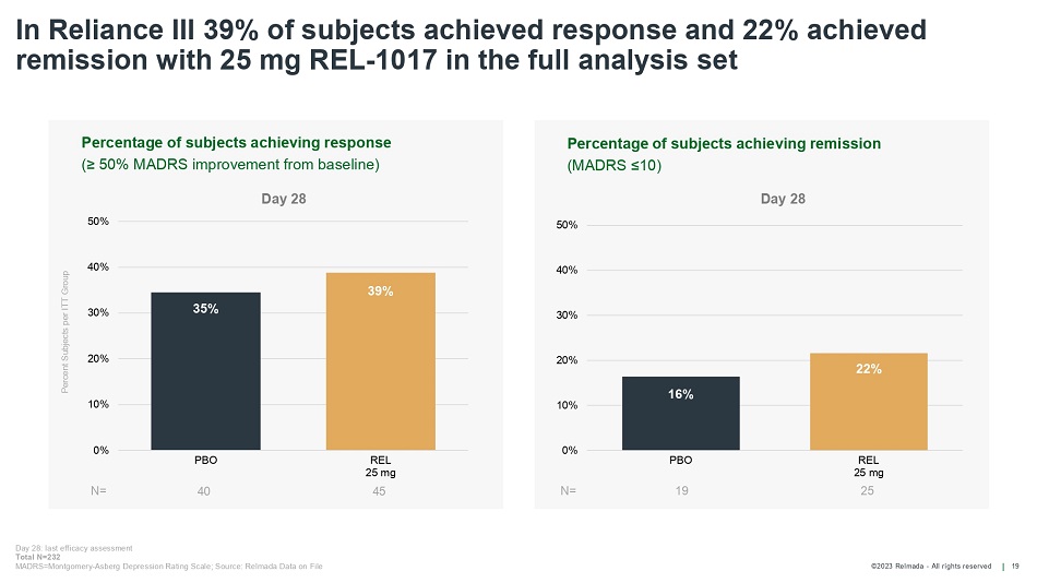 ©2023 Relmada - All rights reserved Reliance III primary efficacy endpoint: REL - 1017 showed non - significant difference in MADRS vs placebo at Day 28 18 MADRS (N=232) Placebo N=116, 25 mg N=116, 45 sites Day 4 Day 7 Day 14 Day 21 Day 28 End of treatment Placebo Mean (SD) - 8.5, (8.9) - 9.2 (9.5) - 11.7 10.1) - 11.9 (9.9) - 13.9 (10.8) 25 mg Mean (SD) - 9.7 (9.1) - 10.7 (10.2) - 12.9 (10.4) - 14.5 (11.9) - 14.8 (12.4) REL - 1017 vs Placebo LS Mean Diff (SE); p - value, MMRM - 0.45 (1.26) 0.7228 - 0.84 (1.30) 0.5176 - 0.31 (1.39) 0.8215 - 1.34 (1.48) 0.3683 0.3 (1.58) 0.8466 - 0.9 diff. REL - 1017 vs. placebo Day 28: last efficacy assessment Total N=232 MADRS=Montgomery - Asberg Depression Rating Scale; Source: Relmada Data on File LS mean score with 95% CI - 15 0 - 3 - 6 - 9 - 12 - 18 Placebo REL - 1017 25mg