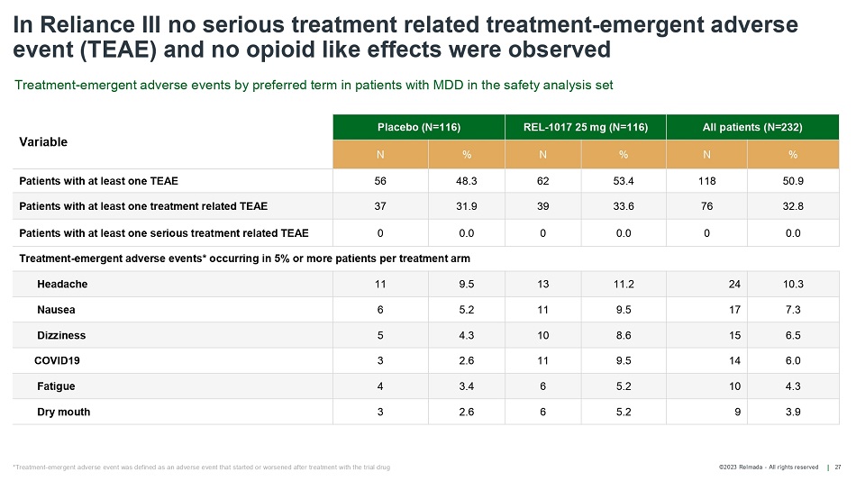 ©2023 Relmada - All rights reserved In Reliance I no serious treatment related treatment - emergent adverse event (TEAE) and no opioid like effects were observed 26 Variable Placebo (N=114) REL - 1017 25 mg (N=113) All patients (N=227) N % N % N % Patients with at least one TEAE 61 53.5 55 48.7 116 51.1 Patients with at least one treatment related TEAE 28 24.6 30 26.5 58 25.6 Patients with at least one serious treatment related TEAE 0 0.0 0 0.0 0 0.0 Headache 9 7.9 13 11.5 22 9.7 COVID19 10 8.8 6 5.3 16 7.0 Upper respiratory tract infection 6 5.3 8 7.1 14 6.2 Nausea 5 4.4 8 7.1 13 5.7 Diarrhea 7 6.1 5 4.4 12 5.3 Constipation 7 6.1 3 2.7 10 4.4 Dizziness 2 1.8 7 6.2 9 4.0 Treatment - emergent adverse events* occurring in 5% or more patients per treatment arm Treatment - emergent adverse events by preferred term in patients with MDD in the safety analysis set *Treatment - emergent adverse event was defined as an adverse event that started or worsened after treatment with the trial drug