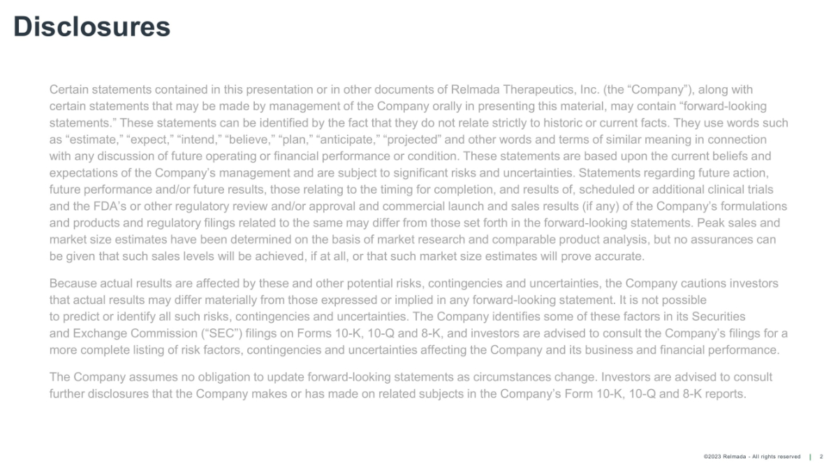 ©2023 Relmada - All rights reserved Disclosures 2 Certain statements contained in this presentation or in other documents of Relmada Therapeutics, Inc. (the “Company”), along with certain statements that may be made by management of the Company orally in presenting this material, may contain “forward - looking statements.” These statements can be identified by the fact that they do not relate strictly to historic or current facts. They use words such as “estimate,” “expect,” “intend,” “believe,” “plan,” “anticipate,” “projected” and other words and terms of similar meaning in connection with any discussion of future operating or financial performance or condition. These statements are based upon the current beliefs and expectations of the Company’s management and are subject to significant risks and uncertainties. Statements regarding future action, future performance and/or future results, those relating to the timing for completion, and results of, scheduled or additional clinical trials and the FDA’s or other regulatory review and/or approval and commercial launch and sales results (if any) of the Company’s formulations and products and regulatory filings related to the same may differ from those set forth in the forward - looking statements. Peak sales and market size estimates have been determined on the basis of market research and comparable product analysis, but no assurances can be given that such sales levels will be achieved, if at all, or that such market size estimates will prove accurate. Because actual results are affected by these and other potential risks, contingencies and uncertainties, the Company cautions investors that actual results may differ materially from those expressed or implied in any forward - looking statement. It is not possible to predict or identify all such risks, contingencies and uncertainties. The Company identifies some of these factors in its Securities and Exchange Commission (“SEC”) filings on Forms 10 - K, 10 - Q and 8 - K, and investors are advised to consult the Company’s filings for a more complete listing of risk factors, contingencies and uncertainties affecting the Company and its business and financial performance. The Company assumes no obligation to update forward - looking statements as circumstances change. Investors are advised to consult further disclosures that the Company makes or has made on related subjects in the Company’s Form 10 - K, 10 - Q and 8 - K reports.