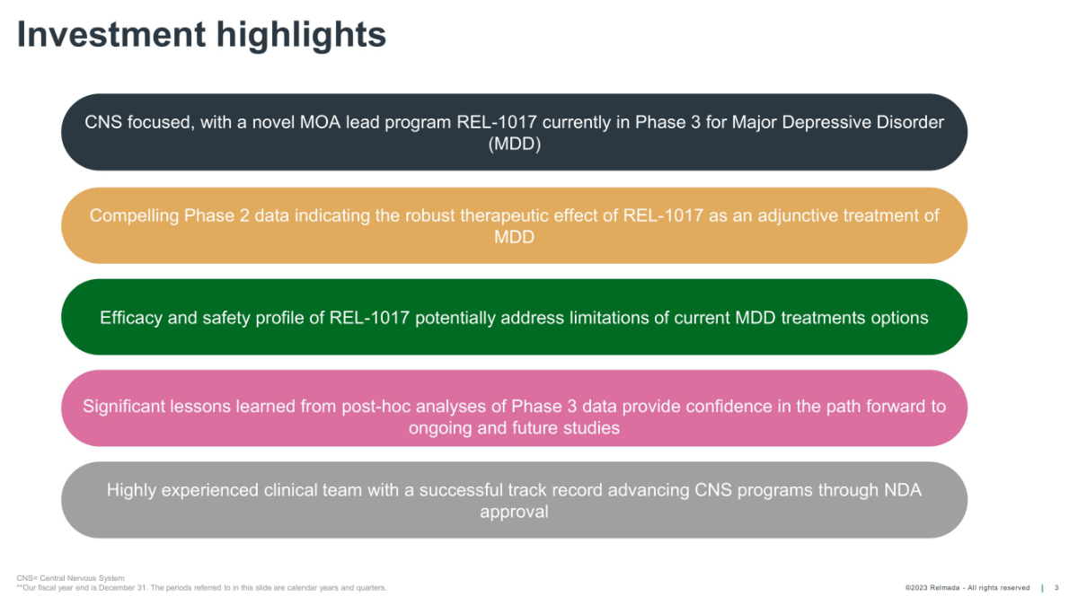 ©2023 Relmada - All rights reserved Significant lessons learned from post - hoc analyses of Phase 3 data provide confidence in the path forward to ongoing and future studies Highly experienced clinical team with a successful track record advancing CNS programs through NDA approval Efficacy and safety profile of REL - 1017 potentially address limitations of current MDD treatments options Investment highlights 3 CNS= Central Nervous System **Our fiscal year end is December 31. The periods referred to in this slide are calendar years and quarters. CNS focused, with a novel MOA lead program REL - 1017 currently in Phase 3 for Major Depressive Disorder (MDD) Compelling Phase 2 data indicating the robust therapeutic effect of REL - 1017 as an adjunctive treatment of MDD