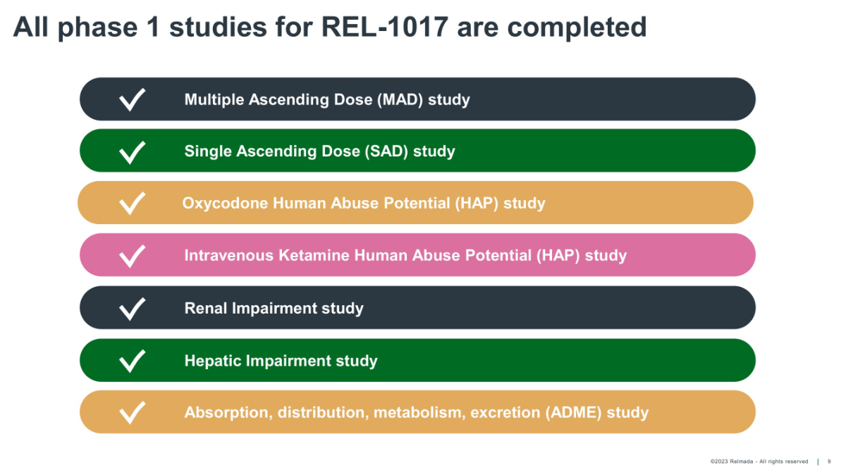 ©2023 Relmada - All rights reserved Significant progress on the path to NDA 28 All non - clinical & phase 1 studies completed All Human Abuse Potential studies (HAPs) completed Stability testing of primary packaging completed and production at scale completed Considerable safety data collected from two phase 3 studies and open - label extension