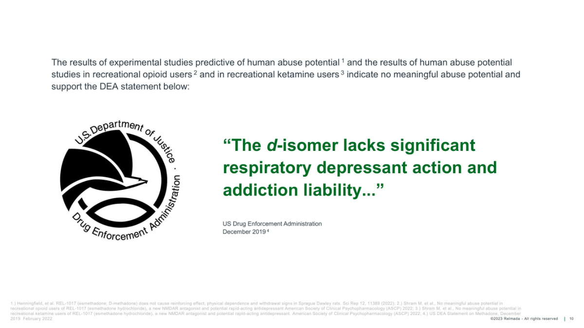 ©2023 Relmada - All rights reserved 10 “The d - isomer lacks significant respiratory depressant action and addiction liability...” US Drug Enforcement Administration December 2019 4 1.) Henningfield, et al. REL - 1017 (esmethadone; D - methadone) does not cause reinforcing effect, physical dependence and withdrawal signs in Sprague Dawley rats. Sci Rep 12, 11389 (2022); 2.) Shram M, et al., No meaningful abuse potential in recreational opioid users of REL - 1017 (esmethadone hydrochloride), a new NMDAR antagonist and potential rapid - acting antidepressant American Society of Clinical Psychopharmacology (ASCP) 2022; 3.) Shram M, et al., No meaningful abuse potential in recreational ketamine users of REL - 1017 (esmethadone hydrochloride), a new NMDAR antagonist and potential rapid - acting antidepressant. American Society of Clinical Psychopharmacology (ASCP) 2022; 4.) US DEA Statement on Methadone, December 2019 February 2022 The results of experimental studies predictive of human abuse potential 1 and the results of human abuse potential studies in recreational opioid users 2 and in recreational ketamine users 3 indicate no meaningful abuse potential and support the DEA statement below:
