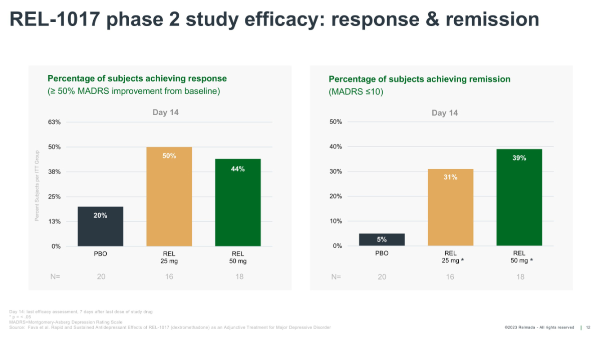 ©2023 Relmada - All rights reserved Unique profile of REL - 1017 addresses limitations of current treatments Potential as a rapid, oral, once - daily antidepressant for MDD, if approved 7 MDD = major depressive disorder; NMDAR = N - methyl - D - aspartate receptor 1) Bettini E al. Pharmacological Comparative Characterization of REL - 1017 (Esmethadone - HCl) and Other NMDAR Channel Blockers in Human Heterodimeric N - Methyl - D - Aspartate Receptors. Pharmaceuticals (Basel). 2022;15(8):997; 2) Bettini E et al. The N - Methyl - D - Aspartate Receptor Blocker REL - 1017 (Esmethadone) Reduces Calcium Influx Induced by Glutamate, Quinolinic Acid, and Gentamicin. Pharmaceuticals (Basel). 2022;15(7):882; 3.) Stahl SM et al. Esmethadone (REL - 1017) and Other Uncompetitive NMDAR Channel Blockers May Improve Mood Disorders via Modulation of Synaptic Kinase - Mediated Signaling. Int J Mol Sci. 2022;23(20); 4.) Fava M et al. REL - 1017 (Esmethadone) as Adjunctive Treatment in Patients With Major Depressive Disorder: A Phase 2a Randomized Double - Blind Trial. Am J Psychiatry. 2022;179(2):122 - 131; 5.) Bernstein et al. Characterization of the Safety and Pharmacokinetic Profile of D - Methadone, a Novel N - Methyl - D - Aspartate Receptor Antagonist in Healthy, Opioid - Naive Subjects: Results of Two Phase 1 Studies. J Clin Psychopharmacol. 2019;39(3):226 - 237; 6.) Relmada data on file Clinical data has demonstrated: • Robust, rapid, and sustained statistically significant antidepressant effects on all tested scales 4 • Rapid onset: significant efficacy effects by Day 4 4 • Favorable safety and tolerability profile consistent across all studies 4,5,6 : no opioid and no psychotomimetic adverse events and no metabolic side effects 4,5,6 • Orally administered, once - daily tablet Novel Mechanism of Action: preferential targeting of NMDAR channels potentially associated with MDD 1,2,3