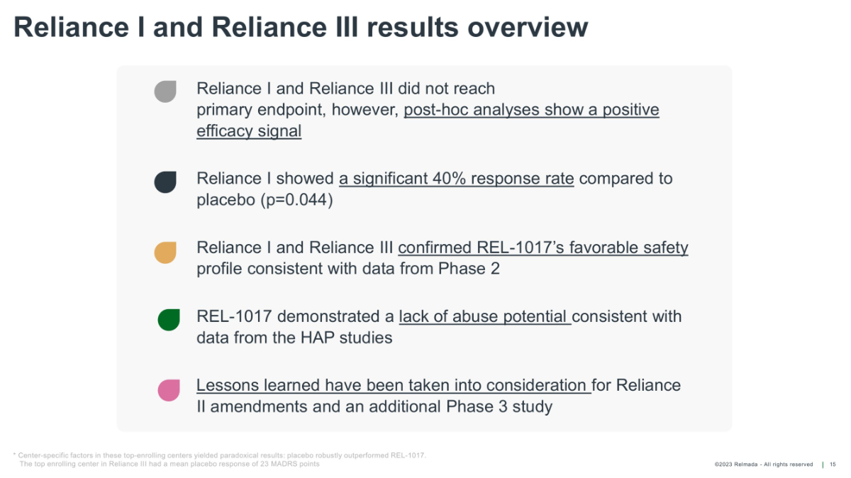 ©2023 Relmada - All rights reserved Randomized, two - arm, placebo - controlled pivotal study as a monotherapy treatment for patients with MDD. In patients experiencing an untreated MDE (patients receiving no ADT) Primary Endpoint: Change in MADRS at Day 28 Key Secondary Endpoints: • Change in CGI - S score at Day 28 • Change in MADRS score at Day 7 Randomized two - arm, placebo - controlled pivotal studies in patients with MDD and inadequate response to ongoing standard antidepressant treatment. These are two studies conducted one after the other. In MDD patients with inadequate response to 1 - 3 ADT in the current MDE Primary Endpoint: Change in MADRS at Day 28 Key Secondary Endpoints: • Change in CGI - S score at Day 28 • Change in MADRS score at Day 7 Long - term, open - label safety study. Patients continuing from Reliance I, II & III Patients new to REL - 1017 REL - 1017 phase 3 program for the treatment of MDD 14 MDD = major depressive disorder; ADT = antidepressant treatment ; OLS = open label study; MADRS = Montgomery - Asberg Depression Rating Scale; CGIs = Clinical Global Impression scales; MDE = major depressive episode Additional phase 3 adjunctive MDD trial Trial design in preparation with consideration of the lessons learned from Reliance I and III +