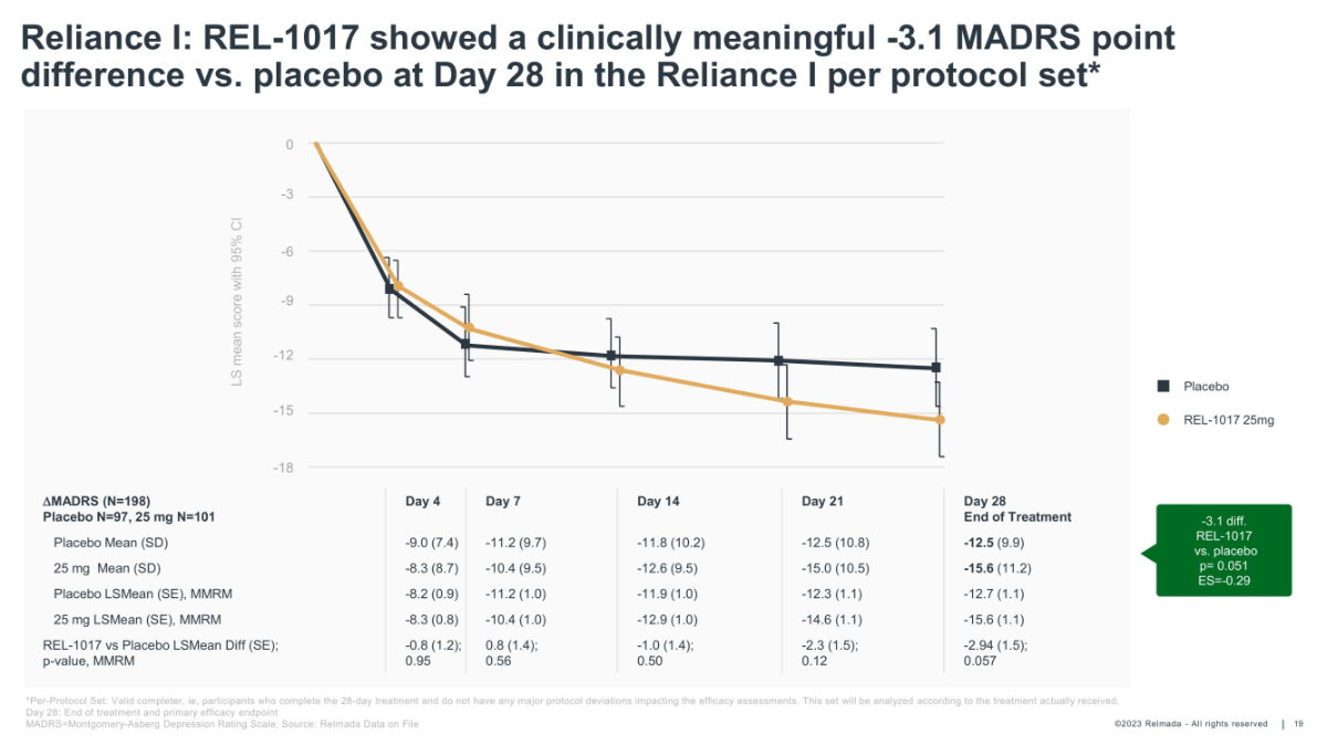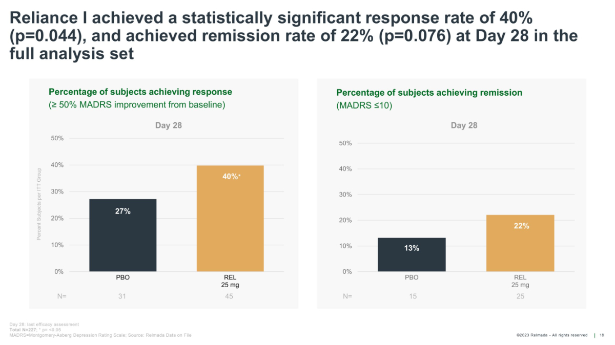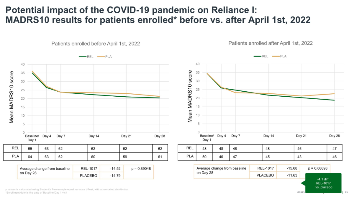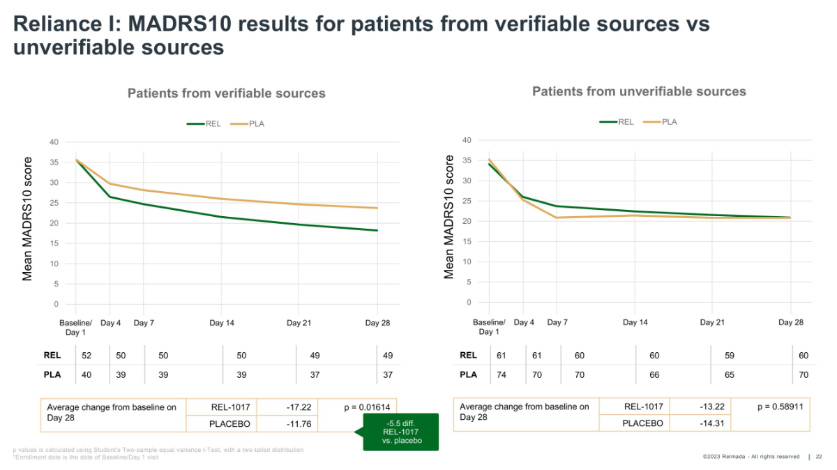 ©2023 Relmada - All rights reserved Baseline/ Day 4 Day 1 Day 7 Day 14 Day 21 Day 28 Reliance I: MADRS10 results for patients from verifiable sources vs unverifiable sources 22 REL 52 50 50 50 49 49 PLA 40 39 39 39 37 37 Average change from baseline on Day 28 REL - 1017 - 17.22 PLACEBO - 11.76 Average change from baseline on Day 28 REL - 1017 - 13.22 p = 0.58911 PLACEBO - 14.31 Mean MADRS10 score Mean MADRS10 score Baseline/ Day 4 Day 1 Day 7 Day 14 Day 21 Day 28 REL 61 61 60 60 59 60 PLA 74 70 70 66 65 70 p values is calculated using Student's Two - sample equal variance t - Test, with a two - tailed distribution *Enrollment date is the date of Baseline/Day 1 visit 0 5 10 15 20 25 30 35 40 Patients from verifiable sources REL PLA p = 0.01614 - 5.5 diff. REL - 1017 vs. placebo 0 5 10 15 20 25 30 35 40 Patients from unverifiable sources REL PLA