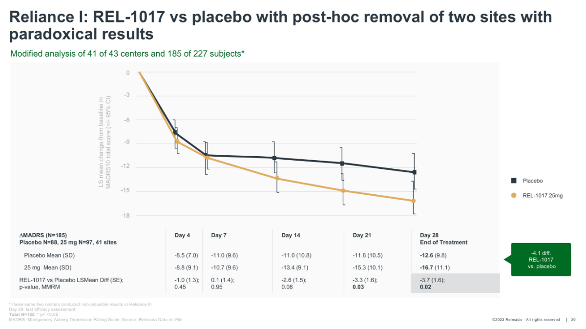 ©2023 Relmada - All rights reserved Reliance I: REL - 1017 showed a clinically meaningful - 3.1 MADRS point difference vs. placebo at Day 28 in the Reliance I per protocol set* 19 - 3.1 diff. REL - 1017 vs. placebo p= 0.051 ES= - 0.29 LS mean score with 95% CI Placebo REL - 1017 25mg *Per - Protocol Set: Valid completer, ie, participants who complete the 28 - day treatment and do not have any major protocol deviations impacting the efficacy assessments. This set will be analyzed according to the treatment actually received. Day 28: End of treatment and primary efficacy endpoint MADRS=Montgomery - Asberg Depression Rating Scale; Source: Relmada Data on File MADRS (N=198) Placebo N=97, 25 mg N=101 Day 4 Day 7 Day 14 Day 21 Day 28 End of Treatment Placebo Mean (SD) - 9.0 (7.4) - 11.2 (9.7) - 11.8 (10.2) - 12.5 (10.8) - 12.5 (9.9) 25 mg Mean (SD) - 8.3 (8.7) - 10.4 (9.5) - 12.6 (9.5) - 15.0 (10.5) - 15.6 (11.2) Placebo LSMean (SE), MMRM - 8.2 (0.9) - 11.2 (1.0) - 11.9 (1.0) - 12.3 (1.1) - 12.7 (1.1) 25 mg LSMean (SE), MMRM - 8.3 (0.8) - 10.4 (1.0) - 12.9 (1.0) - 14.6 (1.1) - 15.6 (1.1) REL - 1017 vs Placebo LSMean Diff (SE); p - value, MMRM - 0.8 (1.2); 0.95 0.8 (1.4); 0.56 - 1.0 (1.4); 0.50 - 2.3 (1.5); 0.12 - 2.94 (1.5); 0.057 - 15 0 - 3 - 6 - 9 - 12 - 18