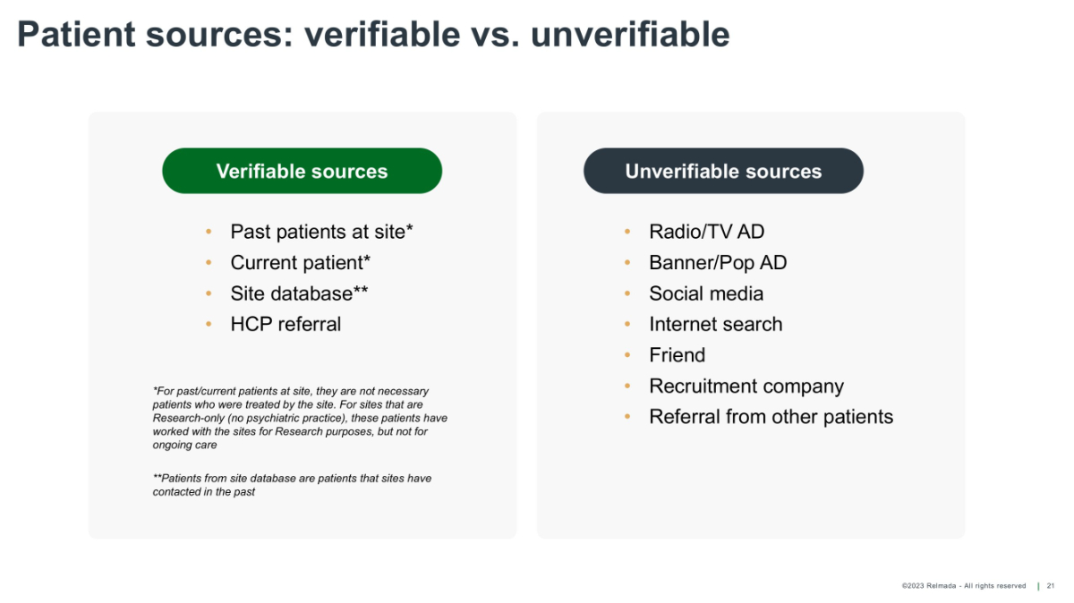 ©2023 Relmada - All rights reserved Patient sources: verifiable vs. unverifiable 21 Verifiable sources • Past patients at site* • Current patient* • Site database** • HCP referral Unverifiable sources • Radio/TV AD • Banner/Pop AD • Social media • Internet search • Friend • Recruitment company • Referral from other patients *For past/current patients at site, they are not necessary patients who were treated by the site. For sites that are Research - only (no psychiatric practice), these patients have worked with the sites for Research purposes, but not for ongoing care **Patients from site database are patients that sites have contacted in the past