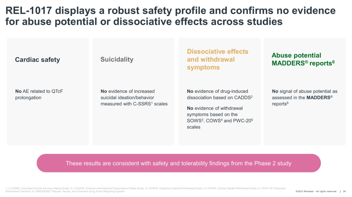 ©2023 Relmada - All rights reserved REL - 1017 displays a robust safety profile and confirms no evidence for abuse potential or dissociative effects across studies 24 1.) C - SSRS: Columbia Suicide Severity Rating Scale; 2.) CADDS: Clinician - Administered Dissociative States Scale; 3.) SOWS: Subjective Opioid Withdrawal Scale; 4.) COWS: Clinical Opiate Withdrawal Scale; 5.) PWC - 20: Physician Withdrawal Checklist; 6.) MADDERS ® : Misuse, Abuse, and Diversion Drug Event Reporting System No AE related to QTcF prolongation No evidence of increased suicidal ideation/behavior measured with C - SSRS 1 scales No evidence of drug - induced dissociation based on CADDS 2 No evidence of withdrawal symptoms based on the SOWS 3 , COWS 4 and PWC - 20 5 scales No signal of abuse potential as assessed in the MADDERS ® reports 6 Cardiac safety Suicidality Dissociative effects and withdrawal symptoms Abuse potential MADDERS ® reports 6 These results are consistent with safety and tolerability findings from the Phase 2 study