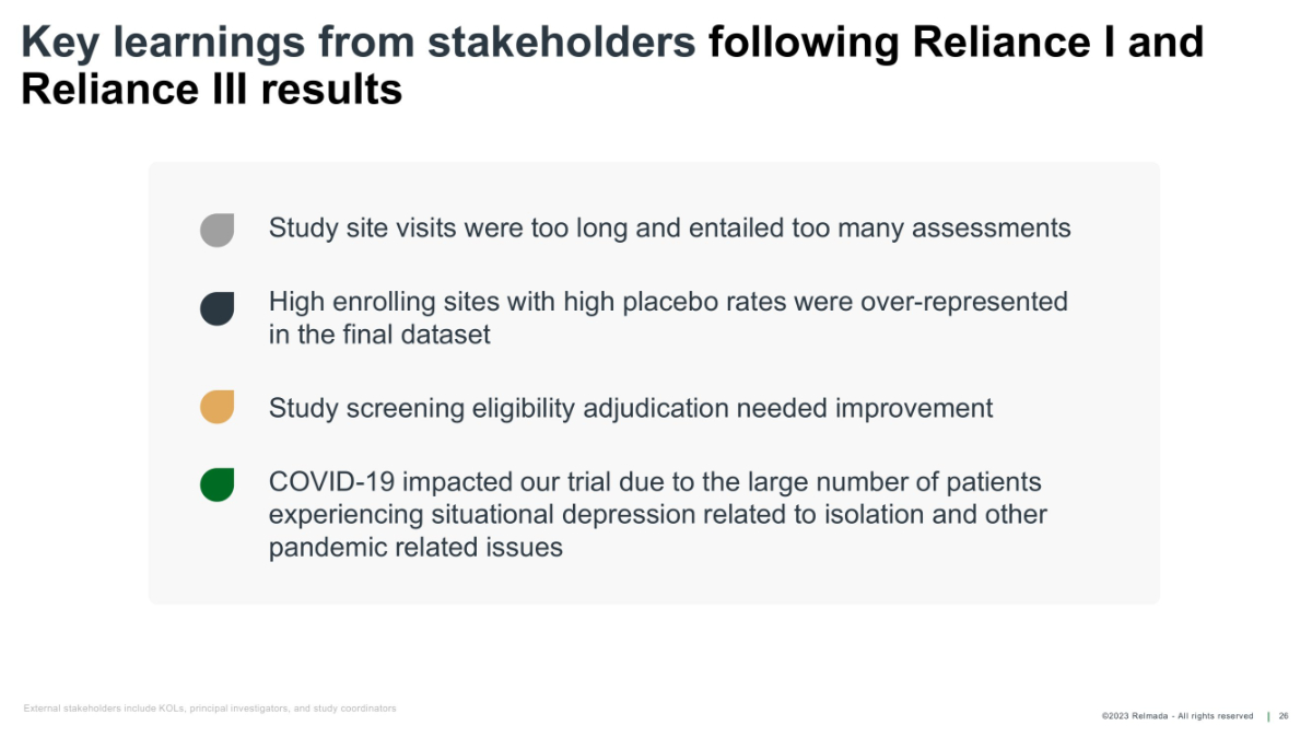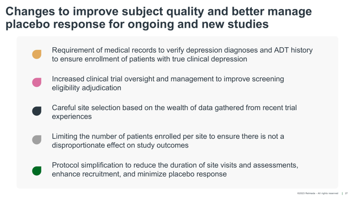 ©2023 Relmada - All rights reserved Key learnings from stakeholders following Reliance I and Reliance III results Study site visits were too long and entailed too many assessments High enrolling sites with high placebo rates were over - represented in the final dataset Study screening eligibility adjudication needed improvement COVID - 19 impacted our trial due to the large number of patients experiencing situational depression related to isolation and other pandemic related issues 26 External stakeholders include KOLs, principal investigators, and study coordinators